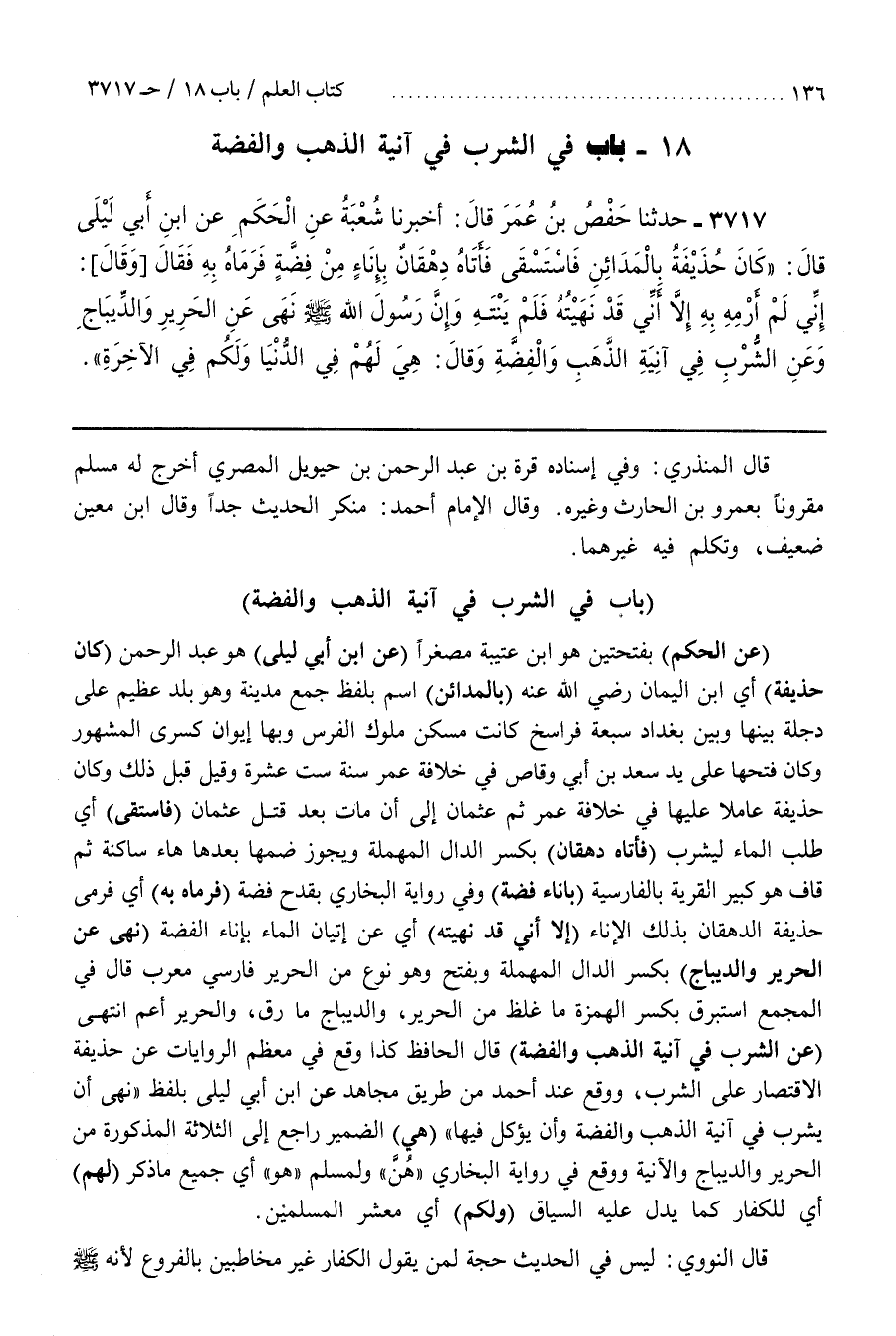 [3723] (عَنِ الْحَكَمِ) بفتحتين هو بن عتيبة مصغرا (عن بن أَبِي لَيْلَى) هُوَ عَبْدُ الرَّحْمَنِ (كَانَ حُذَيْفَةُ) أي بن الْيَمَانِ رَضِيَ اللَّهُ عَنْهُ (بِالْمَدَائِنِ) اسْمٌ بِلَفْظٍ جَمْعُ مَدِينَةٍ وَهُوَ بَلَدٌ عَظِيمٌ عَلَى دِجْلَةَ بَيْنَهَا وَبَيْنَ بَغْدَادَ سَبْعَةُ فَرَاسِخَ كَانَتْ مَسْكَنَ مُلُوكِ الْفُرْسِ وَبِهَا إِيوَانُ كِسْرَى الْمَشْهُورُ وَكَانَ فَتْحُهَا عَلَى يَدِ سَعْدِ بْنِ أَبِي وَقَّاصٍ فِي خِلَافَةِ عُمَرَ سَنَةَ سِتَّ عَشْرَةَ وَقِيلَ قَبْلَ ذَلِكَ وَكَانَ حُذَيْفَةُ عَامِلًا عَلَيْهَا فِي خِلَافَةِ عُمَرَ ثُمَّ عُثْمَانَ إِلَى أَنْ مَاتَ بَعْدَ قَتْلِ عُثْمَانَ (فَاسْتَسْقَى) أَيْ طَلَبَ الْمَاءَ لِيَشْرَبَ (فَأَتَاهُ دِهْقَانٌ) بِكَسْرِ الدَّالِ الْمُهْمَلَةِ وَيَجُوزُ ضَمُّهَا بَعْدَهَا هَاءٌ سَاكِنَةٌ ثُمَّ قَافٌ هُوَ كَبِيرُ الْقَرْيَةِ بِالْفَارِسِيَّةِ (بِإِنَاءِ فِضَّةٍ) وَفِي رِوَايَةِ الْبُخَارِيِّ بِقَدَحِ فِضَّةٍ (فَرَمَاهُ بِهِ) أَيْ فَرَمَى حُذَيْفَةُ الدِّهْقَانَ بِذَلِكَ الْإِنَاءِ (إِلَّا أَنِّي قَدْ نَهَيْتُهُ) أَيْ عَنْ إِتْيَانِ الْمَاءِ بِإِنَاءِ الْفِضَّةِ (نَهَى عَنِ الْحَرِيرِ وَالدِّيبَاجِ) بِكَسْرِ الدَّالِ الْمُهْمَلَةِ وَبِفَتْحٍ وَهُوَ نَوْعٌ مِنَ الْحَرِيرِ فَارِسِيٌّ مُعَرَّبٌ قَالَ فِي الْمَجْمَعِ إِسْتَبْرَقٌ بِكَسْرِ الْهَمْزَةِ مَا غَلُظَ مِنَ الْحَرِيرِ وَالدِّيبَاجُ مَا رَقَّ وَالْحَرِيرُ أَعَمُّ انْتَهَى (عَنِ الشُّرْبِ فِي آنِيَةِ الذَّهَبِ وَالْفِضَّةِ) قَالَ الْحَافِظُ كَذَا وَقَعَ فِي مُعْظَمِ الرِّوَايَاتِ عَنْ حُذَيْفَةَ الِاقْتِصَارُ عَلَى الشُّرْبِ وَوَقَعَ عنه أحمد من طريق مجاهد عن بن أَبِي لَيْلَى بِلَفْظِ نَهَى أَنْ يُشْرَبَ فِي آنِيَةِ الذَّهَبِ وَالْفِضَّةِ وَأَنْ يُؤْكَلَ فِيهَا (هِيَ) الضَّمِيرُ رَاجِعٌ إِلَى الثَّلَاثَةِ الْمَذْكُورَةِ مِنَ الْحَرِيرِ وَالدِّيبَاجِ وَالْآنِيَةِ وَوَقَعَ فِي رِوَايَةِ الْبُخَارِيِّ هُنَّ وَلِمُسْلِمٍ هُوَ أَيْ جَمِيعُ مَا ذُكِرَ (لَهُمْ) أَيْ لِلْكُفَّارِ كَمَا يَدُلُّ عَلَيْهِ السِّيَاقُ (وَلَكُمْ) أَيْ مَعْشَرَ الْمُسْلِمِينَ