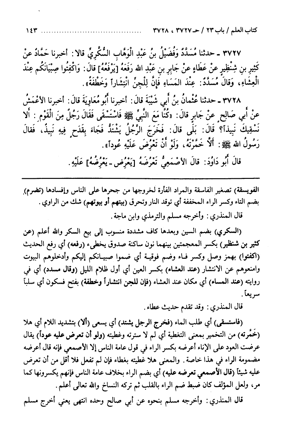 [3733] (السُّكَّرِيُّ) بِضَمِّ السِّينِ وَبَعْدَهَا كَافٌ مُشَدَّدَةٌ مَنْسُوبٌ إِلَى بَيْعِ السُّكَّرِ وَاللَّهُ أَعْلَمُ (عَنْ كَثِيرِ بْنِ شِنْظِيرٍ) بِكَسْرِ الْمُعْجَمَتَيْنِ بَيْنَهُمَا نُونٌ سَاكِنَةٌ صَدُوقٌ يُخْطِئُ (رَفَعَهُ) أَيْ رَفَعَ الْحَدِيثَ (أكفتوا) بِهَمْزِ وَصْلٍ وَكَسْرِ فَاءٍ وَضَمِّ فَوْقِيَّةٍ أَيْ ضُمُّوا صِبْيَانَكُمْ إِلَيْكُمْ وَأَدْخِلُوهُمُ الْبُيُوتَ وَامْنَعُوهُمْ عَنِ الِانْتِشَارِ (عِنْدَ الْعِشَاءِ) بِكَسْرِ الْعَيْنِ أَيْ أَوَّلَ ظَلَامِ اللَّيْلِ (وَقَالَ مُسَدَّدٌ) أَيْ فِي رِوَايَتِهِ (عِنْدَ الْمَسَاءِ) أَيْ مَكَانَ عِنْدَ الْعِشَاءِ (فَإِنَّ لِلْجِنِّ انْتِشَارًا وَخَطْفَةً) بِفَتْحٍ فَسُكُونٍ أَيْ سَلْبًا سَرِيعًا