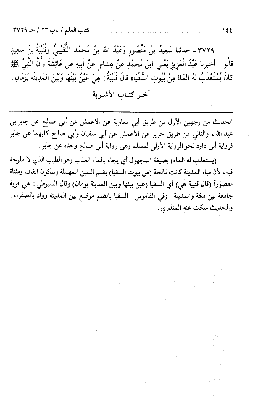 [3735] (يُسْتَعْذَبُ لَهُ الْمَاءُ) بِصِيغَةِ الْمَجْهُولِ أَيْ يُجَاءُ بِالْمَاءِ الْعَذْبِ وَهُوَ الطَّيِّبُ الَّذِي لَا مُلُوحَةَ فِيهِ لِأَنَّ مِيَاهَ الْمَدِينَةِ كَانَتْ مَالِحَةً (مِنْ بُيُوتِ السُّقْيَا) بِضَمِّ السِّينِ الْمُهْمَلَةِ وَسُكُونِ الْقَافِ وَمُثَنَّاةِ مَقْصُورًا (قَالَ قُتَيْبَةُ هِيَ) أَيْ السُّقْيَا (عَيْنٌ بَيْنَهَا وَبَيْنَ الْمَدِينَةِ يَوْمَانِ) وَقَالَ السُّيُوطِيُّ هِيَ قَرْيَةٌ جَامِعَةٌ بَيْنَ مَكَّةَ وَالْمَدِينَةِ