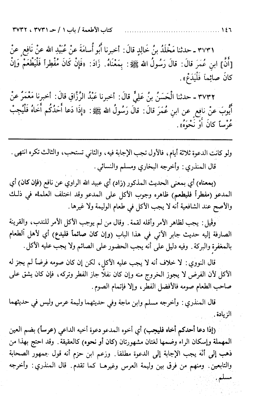 [3737] (بِمَعْنَاهُ) أَيْ بِمَعْنَى الْحَدِيثِ الْمَذْكُورِ (زَادَ) أَيْ عُبَيْدُ اللَّهِ الرَّاوِي عَنْ نَافِعٍ (فَإِنْ كَانَ) أَيِ الْمَدْعُوُّ (مُفْطِرًا فَلْيَطْعَمْ) ظَاهِرُهُ وُجُوبُ الْأَكْلِ عَلَى الْمَدْعُوِّ وَقَدِ اخْتَلَفَ الْعُلَمَاءُ فِي ذَلِكَ وَالْأَصَحُّ عِنْدَ الشَّافِعِيَّةِ أَنَّهُ لَا يَجِبُ الْأَكْلُ فِي طَعَامِ الْوَلِيمَةِ وَلَا غَيْرِهَا