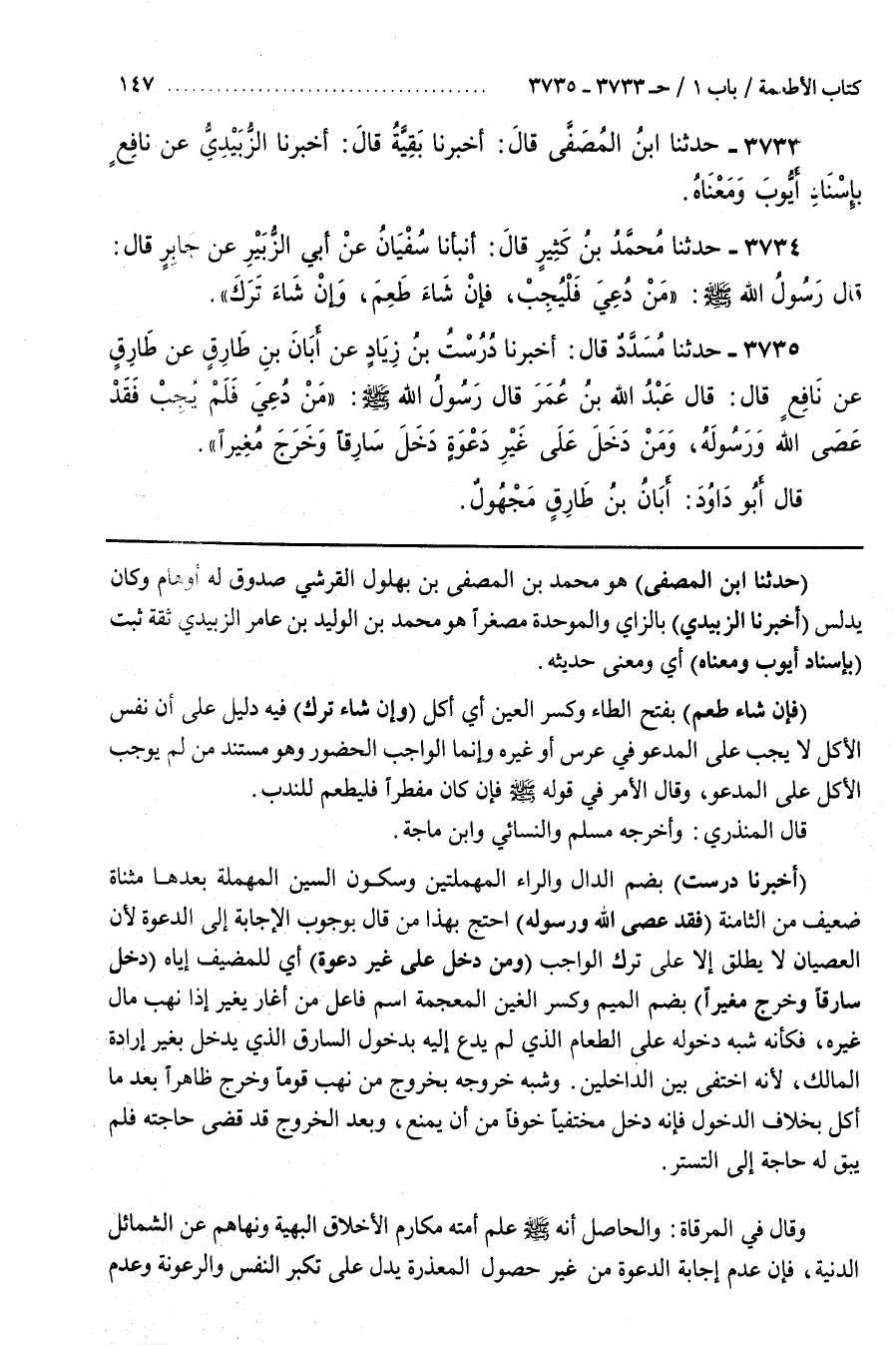 [3741] (أَخْبَرَنَا دُرُسْتُ) بِضَمِّ الدَّالِ وَالرَّاءِ الْمُهْمَلَتَيْنِ وَسُكُونِ السِّينِ الْمُهْمَلَةِ بَعْدَهَا مُثَنَّاةٌ ضَعِيفٌ مِنَ الثَّامِنَةِ (فَقَدْ عَصَى اللَّهَ وَرَسُولَهُ) احْتَجَّ بِهَذَا مَنْ قَالَ بِوُجُوبِ الْإِجَابَةِ إِلَى الدَّعْوَةِ لِأَنَّ الْعِصْيَانَ لَا يُطْلَقُ إِلَّا عَلَى تَرْكِ الْوَاجِبِ (وَمَنْ دَخَلَ عَلَى غَيْرِ دَعْوَةٍ) أَيْ لِلْمُضِيفِ إِيَّاهُ (دَخَلَ سَارِقًا وَخَرَجَ مُغِيرًا) بِضَمِّ الْمِيمِ وَكَسْرِ الْغَيْنِ الْمُعْجَمَةِ اسْمُ فَاعِلٍ مِنْ أَغَارَ يُغِيرُ إِذَا نَهَبَ مَالَ غَيْرِهِ فَكَأَنَّهُ شَبَّهَ دُخُولَهُ عَلَى الطَّعَامِ الَّذِي لَمْ يُدْعَ إِلَيْهِ بِدُخُولِ السَّارِقِ الَّذِي يَدْخُلُ بِغَيْرِ إِرَادَةِ الْمَالِكِ لِأَنَّهُ اخْتَفَى بَيْنَ الدَّاخِلِينَ وَشَبَّهَ خُرُوجَهُ بِخُرُوجِ مَنْ نَهَبَ قَوْمًا وَخَرَجَ ظَاهِرًا بَعْدَ مَا أَكَلَ بِخِلَافِ الدُّخُولِ فَإِنَّهُ دَخَلَ مُخْتَفِيًا خَوْفًا مِنْ أَنْ يُمْنَعَ وَبَعْدَ الْخُرُوجِ قَدْ قَضَى حَاجَتَهُ فَلَمْ يَبْقَ لَهُ حَاجَةٌ إِلَى التَّسَتُّرِ