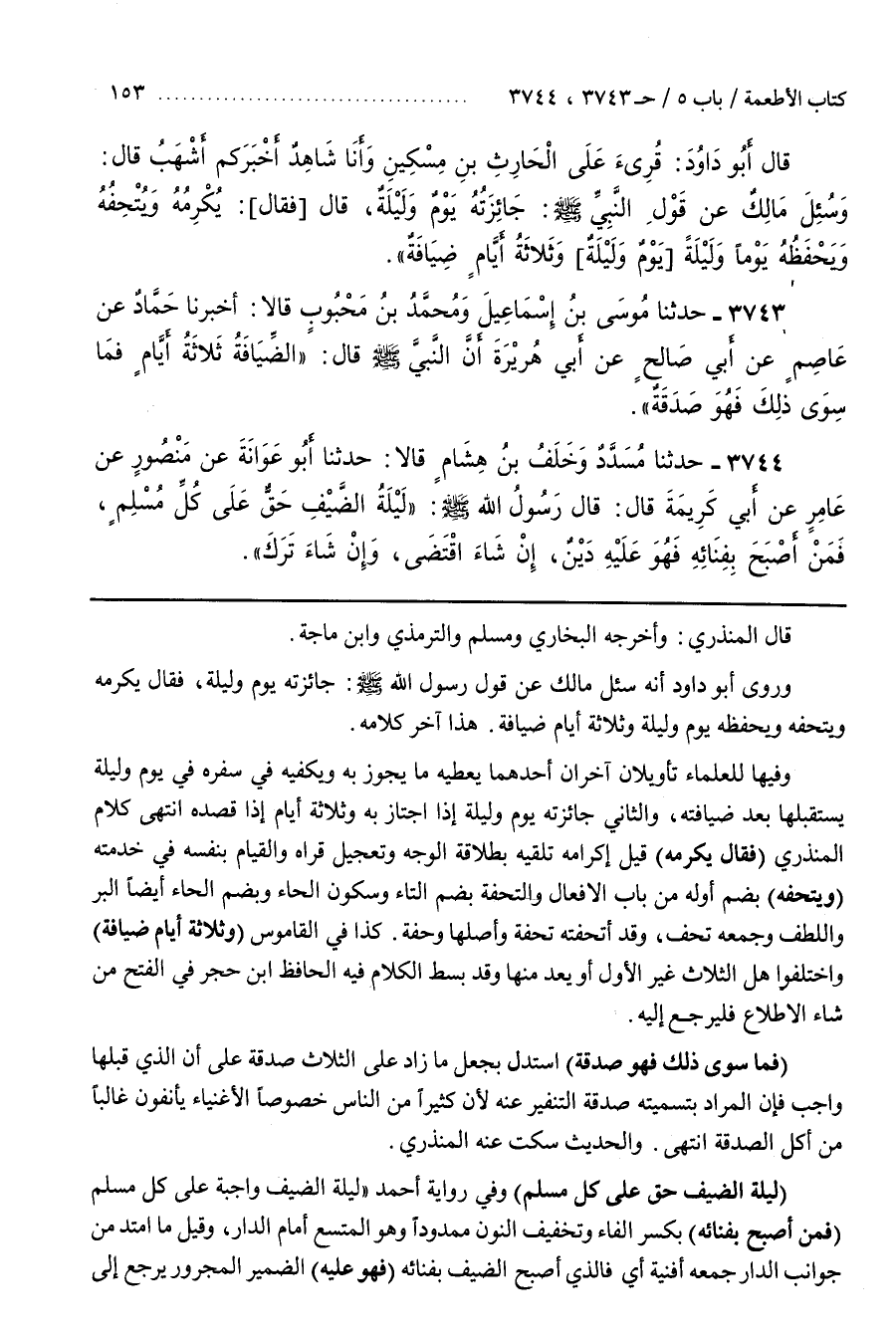 وَرَوَى أَبُو دَاوُدَ أَنَّهُ سُئِلَ مَالِكٌ عَنْ قَوْلِ رَسُولِ اللَّهِ صَلَّى اللَّهُ عَلَيْهِ وَسَلَّمَ جَائِزَتُهُ يَوْمٌ وَلَيْلَةٌ فَقَالَ يُكْرِمُهُ وَيُتْحِفُهُ وَيَحْفَظُهُ يَوْمٌ وَلَيْلَةٌ وَثَلَاثَةُ أَيَّامٍ ضِيَافَةٌ