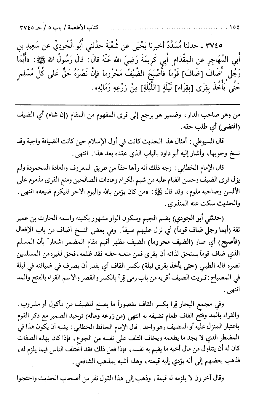 قَالَ السُّيُوطِيُّ أَمْثَالُ هَذَا الْحَدِيثِ كَانَتْ فِي أَوَّلِ الْإِسْلَامِ حِينَ كَانَتِ الضِّيَافَةُ وَاجِبَةً وَقَدْ نُسِخَ وُجُوبُهَا وَأَشَارَ إِلَيْهِ أَبُو دَاوُدَ بِالْبَابِ الَّذِي عَقَدَهُ بَعْدَ هَذَا