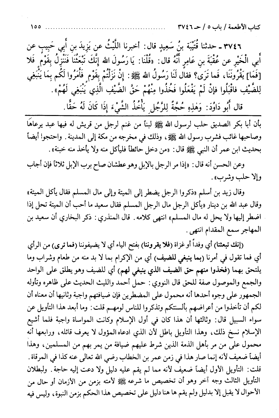 [3752] (إِنَّكَ تَبْعَثُنَا) أَيْ وَفْدًا أَوْ غُزَاةً (فَلَا يَقْرُونَنَا) بِفَتْحِ الْيَاءِ أَيْ لَا يُضَيِّفُونَنَا (فَمَا تَرَى) مِنَ الرَّأْيِ أَيْ فَمَا تَقُولُ فِي أَمْرِنَا (بِمَا يَنْبَغِي لِلضَّيْفِ) أَيْ مِنَ الْإِكْرَامِ بِمَا لَا بُدَّ مِنْهُ مِنْ طَعَامٍ وَشَرَابٍ وَمَا يَلْتَحِقُ بِهِمَا (فَخُذُوا مِنْهُمْ حَقَّ الضَّيْفِ الَّذِي يَنْبَغِي لَهُمْ) أَيْ لِلضَّيْفِ وَهُوَ يُطْلَقُ عَلَى الْوَاحِدِ وَالْجَمْعِ وَالْمَوْصُولُ صِفَةٌ لِلْحَقِّ قَالَ النَّوَوِيُّ حَمَلَ أَحْمَدُ وَاللَّيْثُ الْحَدِيثَ عَلَى ظَاهِرِهِ وَتَأَوَّلَهُ الْجُمْهُورُ عَلَى وُجُوِهٍ أَحَدُهَا أَنَّهُ مَحْمُولٌ عَلَى الْمُضْطَرِّينَ فَإِنَّ ضِيَافَتَهُمْ وَاجِبَةٌ وَثَانِيهَا أَنَّ مَعْنَاهُ أَنَّ لَكُمْ أَنْ تَأْخُذُوا مِنْ أَعْرَاضِهِمْ بِأَلْسِنَتِكُمْ وَتَذْكُرُوا لِلنَّاسِ لَوْمَهُمْ قُلْتُ وَمَا أَبْعَدَ هَذَا التَّأْوِيلَ عَنْ سَوَاءِ السَّبِيلِ قَالَ وَثَالِثُهَا أَنَّ هَذَا التأويل باطل لأن الذي ادعاه المأول لَا يُعْرَفُ قَائِلُهُ وَرَابِعُهَا أَنَّهُ مَحْمُولٌ عَلَى مَنْ مَرَّ بِأَهْلِ الذِّمَّةِ الَّذِي شُرِطَ عَلَيْهِمْ ضِيَافَةُ مَنْ يَمُرُّ بِهِمْ مِنَ الْمُسْلِمِينَ وَهَذَا أَيْضًا ضَعِيفٌ لِأَنَّهُ إِنَّمَا صَارَ هَذَا فِي زَمَنِ عُمَرَ بْنِ الْخَطَّابِ رَضِيَ اللَّهُ تَعَالَى عَنْهُ كَذَا فِي الْمِرْقَاةِ