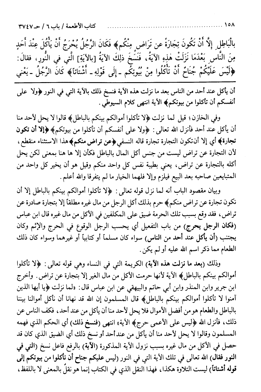 وَذَلِكَ (بعد ما نَزَلَتْ هَذِهِ الْآيَةُ) الْكَرِيمَةُ الَّتِي فِي النِّسَاءِ وَهِيَ قَوْلُهُ تَعَالَى لَا تَأْكُلُوا أَمْوَالَكُمْ بَيْنَكُمْ بالباطل الْآيَةَ لِأَنَّهَا حَرَّمَتِ الْأَكْلَ مِنْ مَالِ الْغَيْرِ إلا بتجارة عن تراض