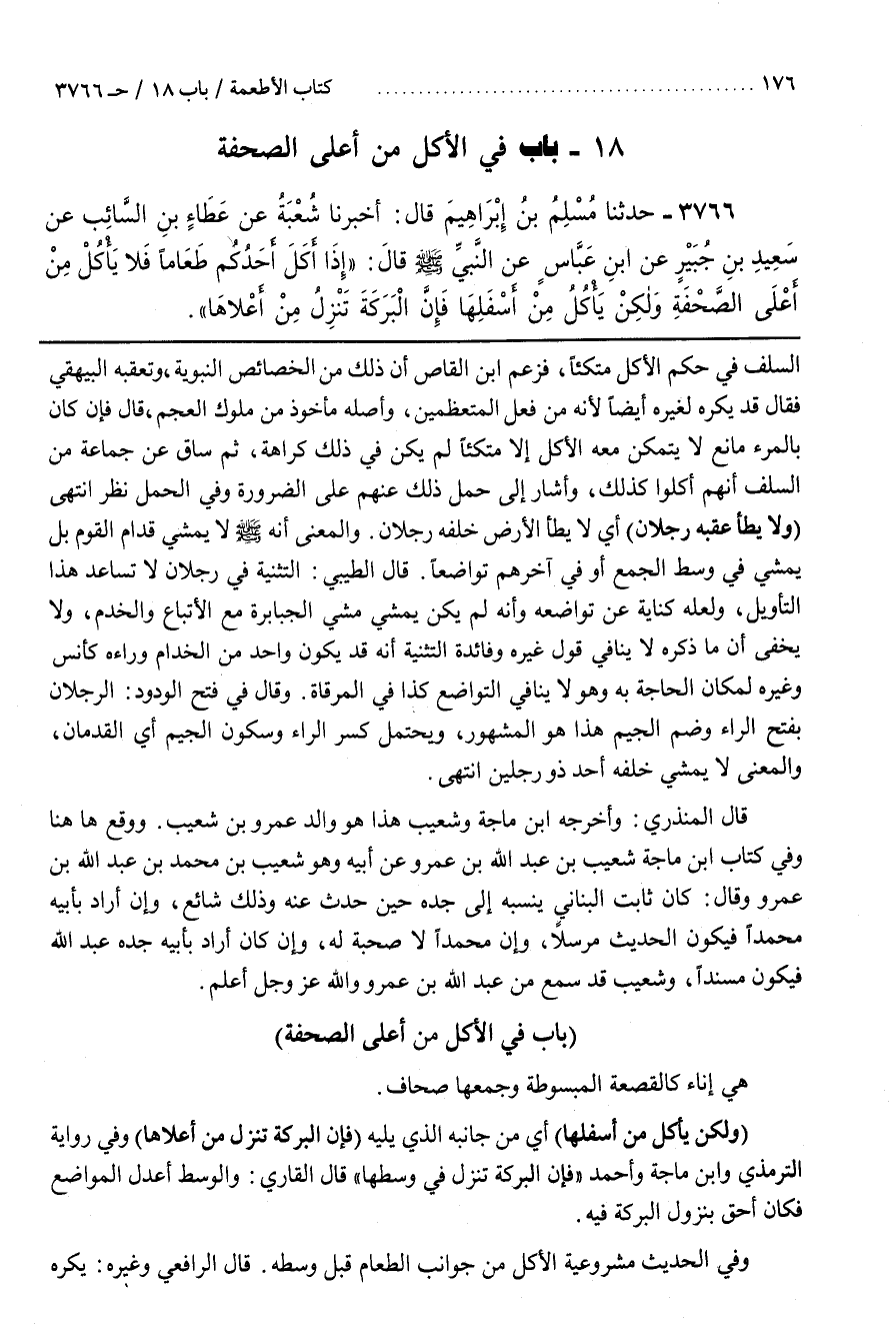 (وَلَكِنْ يَأْكُلُ مِنْ أَسْفَلِهَا) أَيْ مِنْ جَانِبِهِ الَّذِي يَلِيهِ (فَإِنَّ الْبَرَكَةَ تَنْزِلُ مِنْ أَعْلَاهَا) وَفِي رواية الترمذي وبن مَاجَهْ وَأَحْمَدَ فَإِنَّ الْبَرَكَةَ تَنْزِلُ فِي وَسَطِهَا قال القارىء وَالْوَسَطُ أَعْدَلُ الْمَوَاضِعِ فَكَانَ أَحَقَّ بِنُزُولِ الْبَرَكَةِ فِيهِ