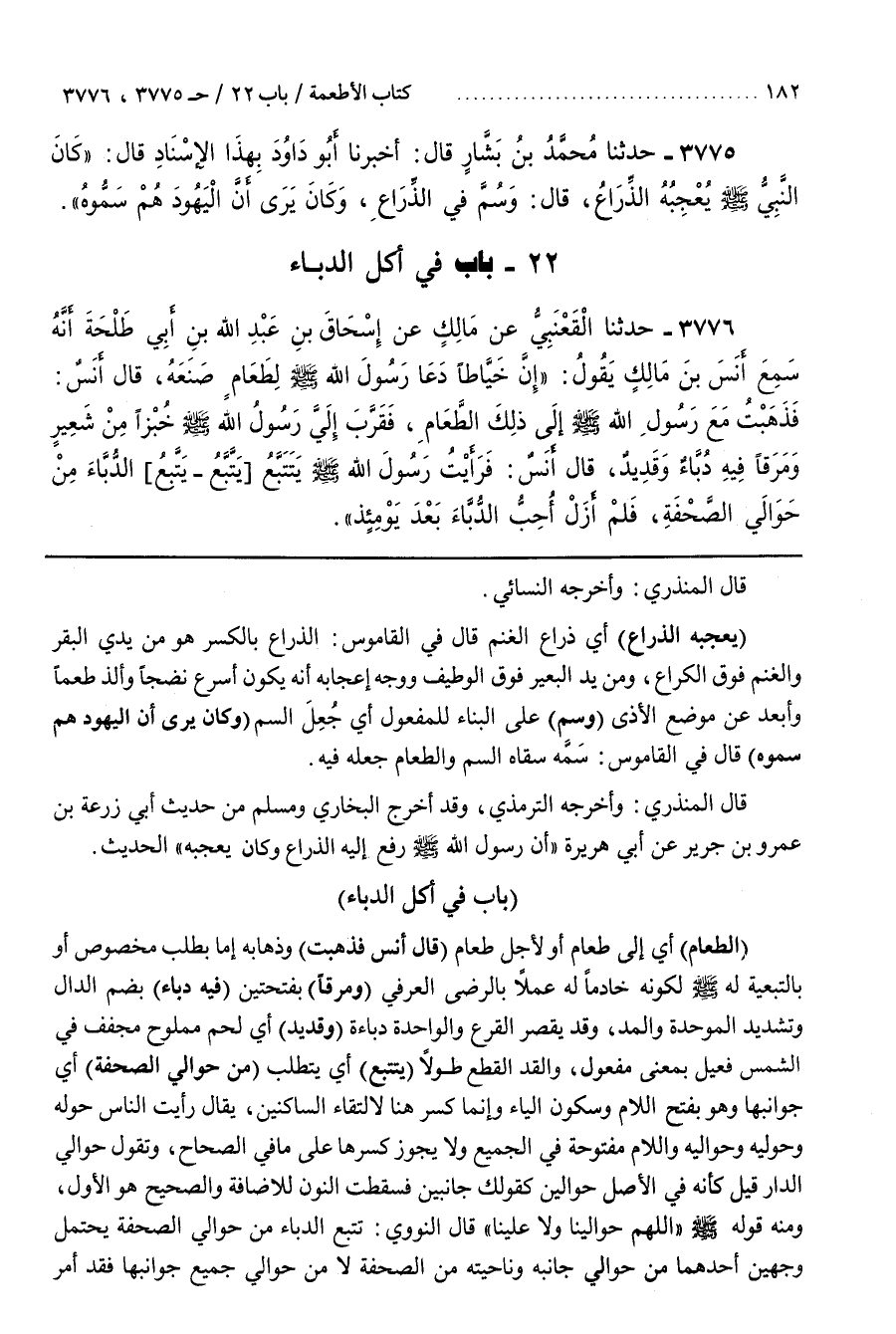 [3782] (الطعام) أَيْ إِلَى طَعَامٍ أَوْ لِأَجْلِ طَعَامٍ (قَالَ أَنَسٌ فَذَهَبْتُ) وَذَهَابُهُ إِمَّا بِطَلَبٍ مَخْصُوصٍ أَوْ بِالتَّبَعِيَّةِ لَهُ صَلَّى اللَّهُ عَلَيْهِ وَسَلَّمَ لِكَوْنِهِ خَادِمًا لَهُ عَمَلًا بِالرِّضَى الْعُرْفِيِّ (وَمَرَقًا) بِفَتْحَتَيْنِ (فِيهِ دُبَّاءٌ) بِضَمِّ الدَّالِ وَتَشْدِيدِ الْمُوَحَّدَةِ وَالْمَدِّ وَقَدْ يُقْصَرُ الْقَرْعُ وَالْوَاحِدَةُ دُبَّاءَةٌ (وَقَدِيدٌ) أَيْ لَحْمٌ مَمْلُوحٌ مُجَفَّفٌ فِي الشَّمْسِ فَعِيلٌ بِمَعْنَى مَفْعُولٍ وَالْقَدُّ الْقَطْعُ طُولًا (يَتَتَبَّعُ) أَيْ يَتَطَلَّبُ (مِنْ حَوَالَيِ الصَّحْفَةِ) أَيْ جَوَانِبِهَا وَهُوَ بِفَتْحِ اللَّامِ وَسُكُونِ الْيَاءِ وَإِنَّمَا كُسِرَ هُنَا لِالْتِقَاءِ السَّاكِنَيْنِ يُقَالُ رَأَيْتُ النَّاسَ حَوْلَهُ وَحَوْلَيْهِ وَحَوَالَيْهِ وَاللَّامُ مَفْتُوحَةٌ فِي الْجَمِيعِ وَلَا يَجُوزُ كَسْرُهَا عَلَى مَا فِي الصِّحَاحِ وَتَقُولُ حَوَالَيِ الدَّارِ قِيلَ كَأَنَّهُ فِي الْأَصْلِ حَوَالَيْنِ كَقَوْلِكَ جَانِبَيْنِ فَسَقَطَتِ النُّونُ لِلْإِضَافَةِ وَالصَّحِيحُ هُوَ الْأَوَّلُ وَمِنْهُ قَوْلُهُ صَلَّى اللَّهُ عَلَيْهِ وَسَلَّمَ اللَّهُمَّ حَوَالَيْنَا وَلَا عَلَيْنَا قَالَ النَّوَوِيُّ تَتَبُّعُ الدُّبَّاءِ مِنْ حَوَالَيِ الصَّحْفَةِ يَحْتَمِلُ وَجْهَيْنِ أَحَدُهُمَا مِنْ حَوَالَيِ جَانِبِهِ وَنَاحِيَتِهِ مِنَ الصَّحْفَةِ لَا مِنْ حَوَالَيْ جميع جوانبها فقد أمر