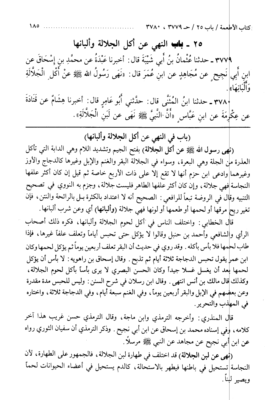 [3785] (نَهَى رَسُولُ اللَّهِ صَلَّى اللَّهُ عَلَيْهِ وَسَلَّمَ عن أَكْلِ الْجَلَّالَةِ) بِفَتْحِ الْجِيمِ وَتَشْدِيدِ اللَّامِ وَهِيَ الدَّابَّةُ الَّتِي تَأْكُلُ الْعَذِرَةَ مِنَ الْجُلَّةِ وَهِيَ الْبَعْرَةُ وَسَوَاءٌ فِي الْجَلَّالَةِ الْبَقَرُ وَالْغَنَمُ وَالْإِبِلُ وغيرها كالدجاج والأوز وغيرهما وادعى بن حَزْمٍ أَنَّهَا لَا تَقَعُ إِلَّا عَلَى ذَاتِ الْأَرْبَعِ خَاصَّةً ثُمَّ قِيلَ إِنْ كَانَ أَكْثَرُ عَلَفِهَا النَّجَاسَةَ فَهِيَ جَلَّالَةٌ وَإِنْ كَانَ أَكْثَرُ عَلَفِهَا الطَّاهِرَ فَلَيْسَتْ جَلَّالَةً وَجَزَمَ بِهِ النَّوَوِيُّ فِي تَصْحِيحِ التَّنْبِيهِ وَقَالَ فِي الرَّوْضَةِ تَبَعًا لِلرَّافِعِيِّ الصَّحِيحُ أَنَّهُ لَا اعْتِدَادَ بِالْكَثْرَةِ بَلْ بِالرَّائِحَةِ وَالنَّتْنِ فَإِنْ تَغَيَّرَ رِيحُ مَرَقِهَا أَوْ لَحْمِهَا أَوْ طَعْمِهَا أَوْ لَوْنِهَا فَهِيَ جَلَّالَةٌ (وَأَلْبَانِهَا) أَيْ وَعَنْ شُرْبِ أَلْبَانِهَا
