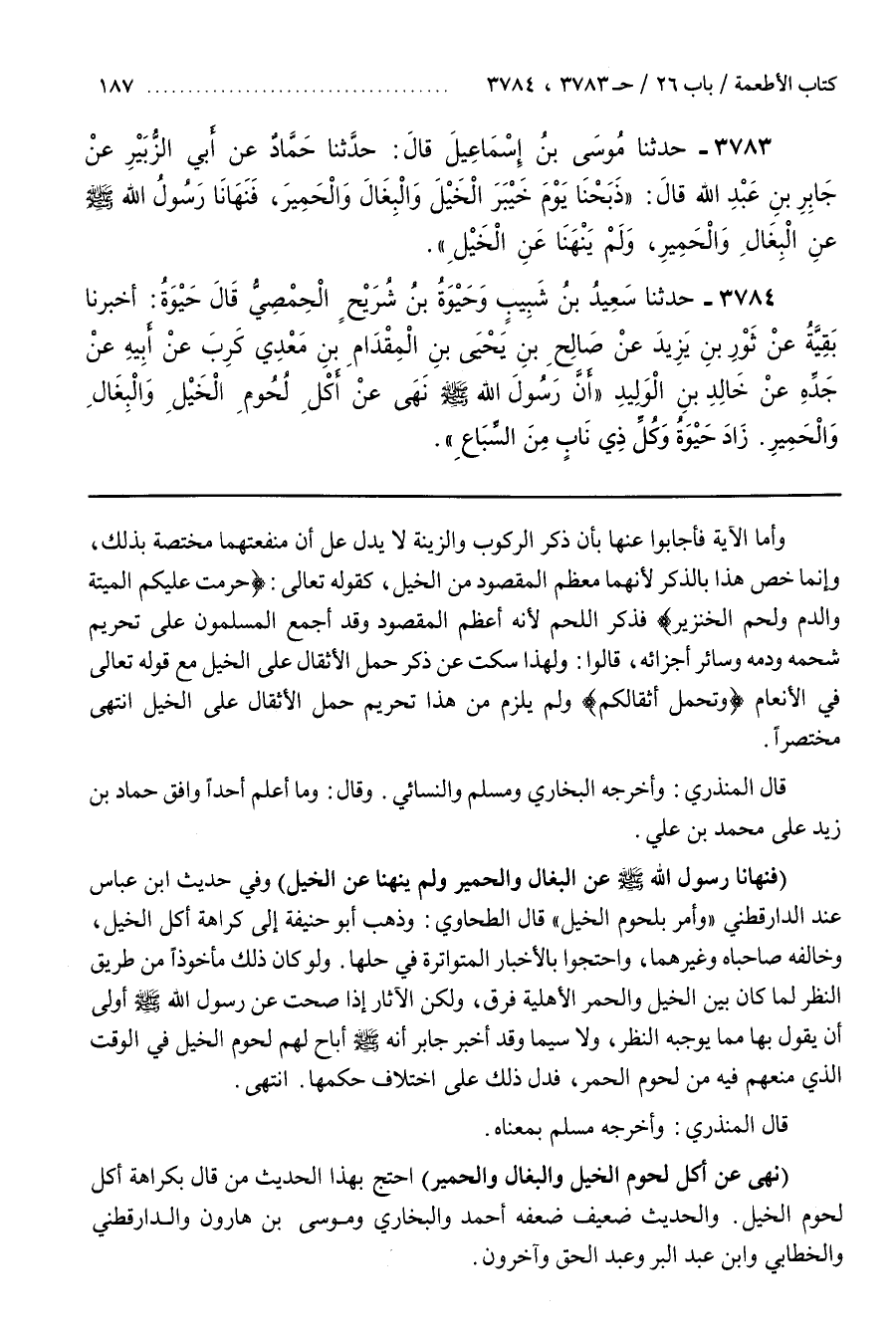 [3790] (نَهَى عَنْ أَكْلِ لُحُومِ الْخَيْلِ وَالْبِغَالِ وَالْحَمِيرِ) احْتَجَّ بِهَذَا الْحَدِيثِ مَنْ قَالَ بِكَرَاهَةِ أَكْلِ لُحُومِ الْخَيْلِ
