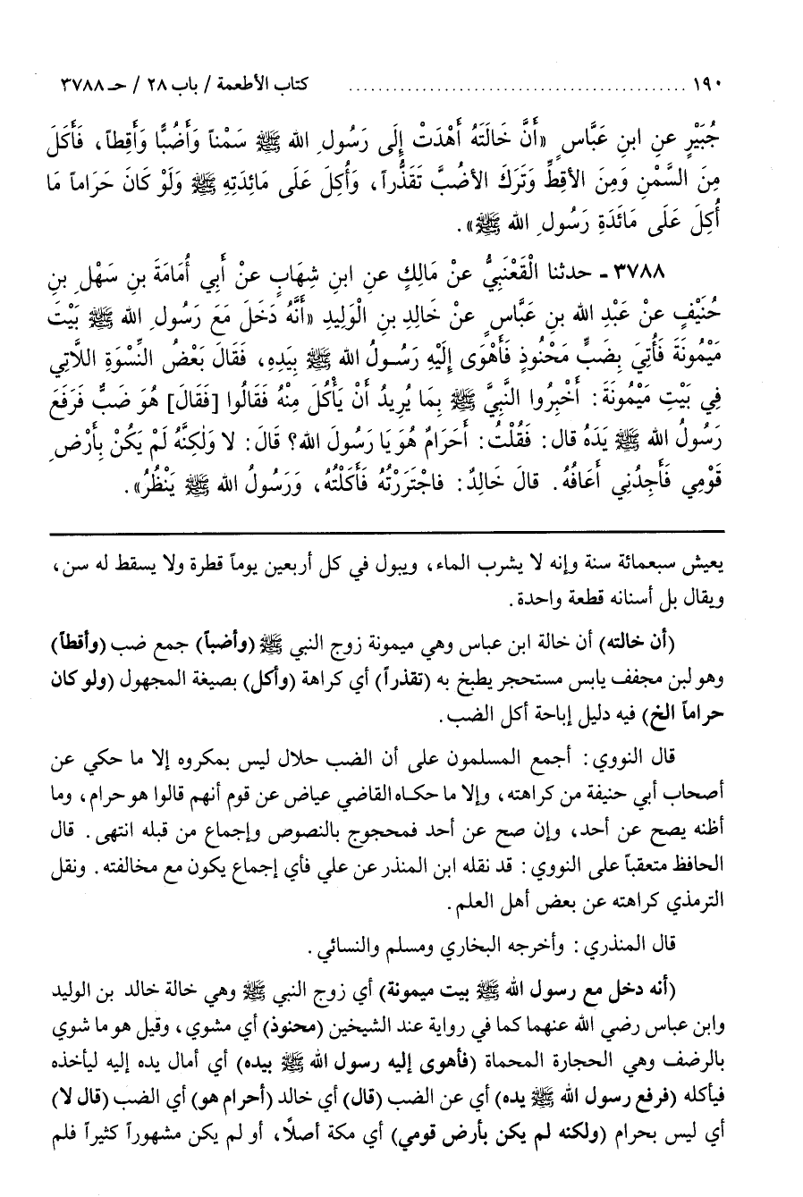[3794] (أَنَّهُ دَخَلَ مَعَ رَسُولِ اللَّهِ صَلَّى اللَّهُ عَلَيْهِ وَسَلَّمَ بَيْتَ مَيْمُونَةَ) أَيْ زَوْجِ النَّبِيِّ صَلَّى اللَّهُ عَلَيْهِ وَسَلَّمَ وَهِيَ خَالَةُ خَالِدِ بن الوليد وبن عَبَّاسٍ رَضِيَ اللَّهُ عَنْهُمَا كَمَا فِي رِوَايَةٍ عِنْدَ الشَّيْخَيْنِ (مَحْنُوذٍ) أَيْ مَشْوِيٍّ وَقِيلَ هُوَ مَا شُوِيَ بِالرَّضْفِ وَهِيَ الْحِجَارَةُ الْمُحْمَاةُ (فَأَهْوَى إِلَيْهِ رَسُولُ اللَّهِ صَلَّى اللَّهُ عَلَيْهِ وَسَلَّمَ بِيَدِهِ) أَيْ أَمَالَ يَدَهُ إِلَيْهِ لِيَأْخُذَهُ فَيَأْكُلَهُ (فَرَفَعَ رَسُولُ اللَّهِ صَلَّى اللَّهُ عَلَيْهِ وَسَلَّمَ يَدَهُ) أَيْ عَنِ الضَّبِّ (قَالَ) أَيْ خَالِدٌ (أَحَرَامٌ هُوَ) أَيِ الضَّبُّ (قَالَ لَا) أَيْ لَيْسَ بِحَرَامٍ (وَلَكِنَّهُ لَمْ يَكُنْ بِأَرْضِ قَوْمِي) أَيْ مَكَّةَ أَصْلًا أَوْ لَمْ يَكُنْ مَشْهُورًا كثيرا فلم