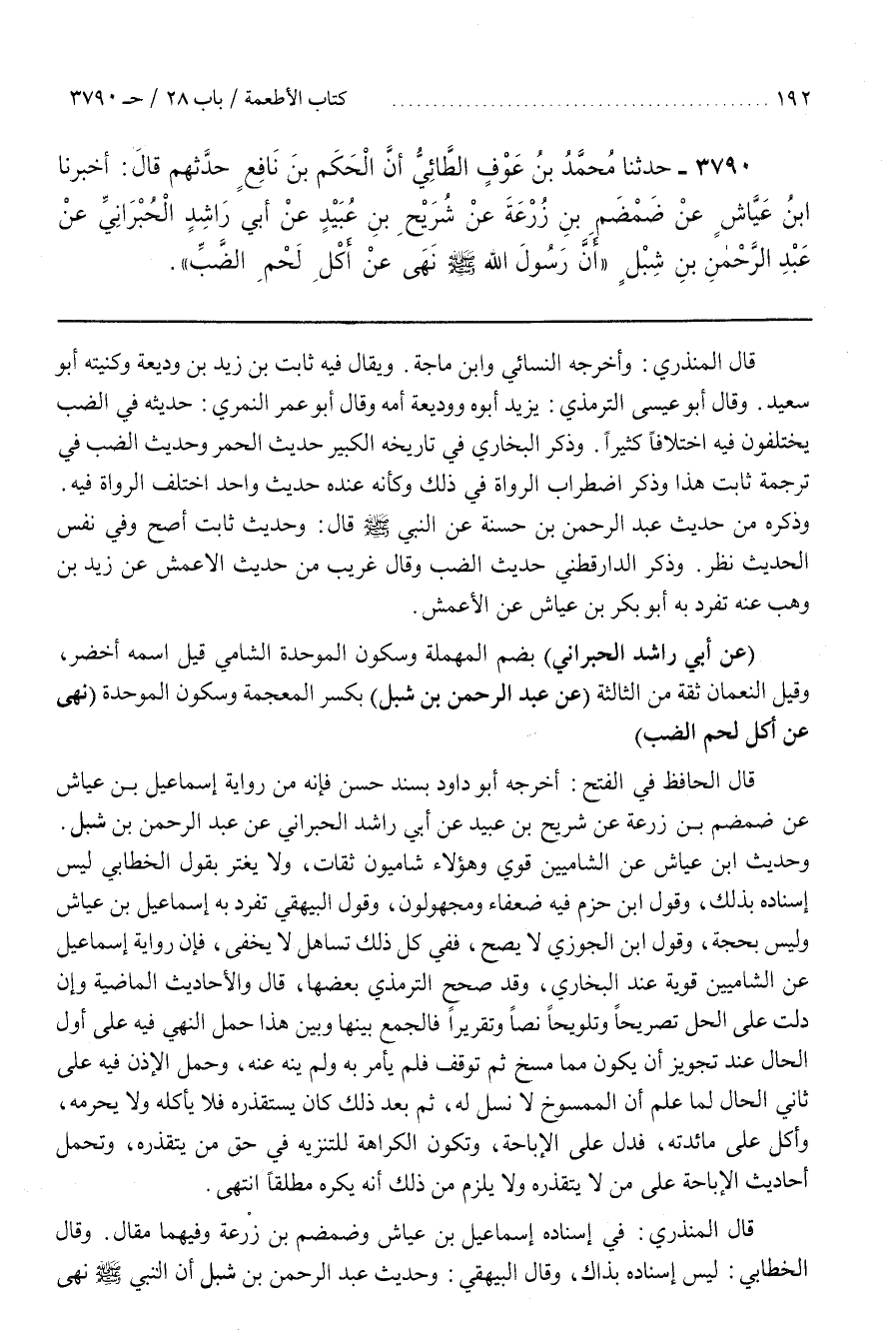 [3796] (عَنْ أَبِي رَاشِدٍ الْحُبْرَانِيِّ) بِضَمِّ الْمُهْمَلَةِ وَسُكُونِ الْمُوَحَّدَةِ الشَّامِيِّ قِيلَ اسْمُهُ أَخْضَرُ وَقِيلَ النُّعْمَانُ ثِقَةٌ مِنَ الثَّالِثَةِ (عَنْ عَبْدِ الرَّحْمَنِ بْنِ شِبْلٍ) بِكَسْرِ الْمُعْجَمَةِ وَسُكُونِ الْمُوَحَّدَةِ (نَهَى عَنْ أَكْلِ لَحْمِ الضَّبِّ)