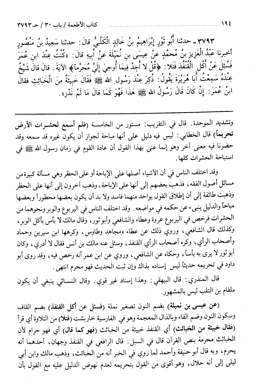 [3799] (عَنْ عِيسَى بْنِ نُمَيْلَةَ) بِضَمِّ النُّونِ تَصْغِيرُ نَمْلَةَ (فَسُئِلَ عَنْ أَكْلِ الْقُنْفُذِ) بِضَمِّ الْقَافِ وَسُكُونِ النُّونِ وَضَمِّ الْفَاءِ وَبِالذَّالِ الْمُعْجَمَةِ وَهُوَ فِي الْفَارِسِيَّةِ خاربشت (فَتَلَا) مِنَ التِّلَاوَةِ أَيْ قَرَأَ (فَقَالَ خَبِيثَةٌ مِنَ الْخَبَائِثِ) أَيِ الْقُنْفُذُ خَبِيثَةٌ مِنَ الْخَبَائِثِ (فَهُوَ كَمَا قَالَ) أَيْ فَهُوَ حَرَامٌ لِأَنَّ الْخَبَائِثَ مُحَرَّمَةٌ بِنَصِّ الْقُرْآنِ قَالَ فِي السُّبُلِ قَالَ الرَّافِعِيُّ فِي الْقُنْفُذِ وَجْهَانِ أَحَدُهُمَا أَنَّهُ يَحْرُمُ وَبِهِ قَالَ أَبُو حَنِيفَةَ وَأَحْمَدُ لِمَا رُوِيَ فِي الْخَبَرِ إِنَّهُ مِنَ الْخَبَائِثِ وَذَهَبَ مَالِكٌ وبن أَبِي لَيْلَى إِلَى أَنَّهُ حَلَالٌ وَهُوَ أَقْوَى مِنَ الْقَوْلِ بِتَحْرِيمِهِ لِعَدَمِ نُهُوضِ الدَّلِيلِ عَلَيْهِ مَعَ الْقَوْلِ بِأَنَّ