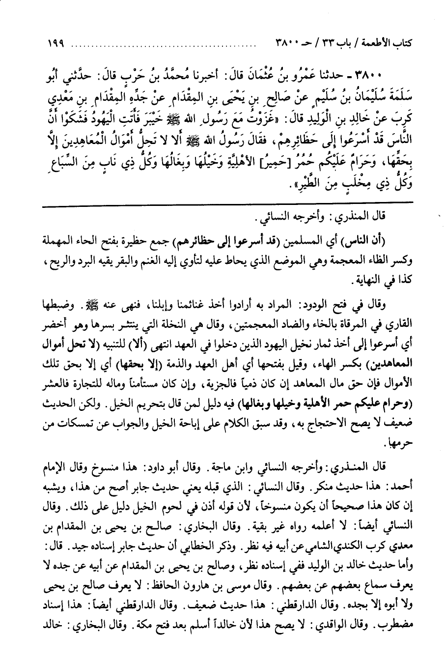 وَلَكِنَّ الْحَدِيثَ ضَعِيفٌ لَا يَصِحُّ الِاحْتِجَاجُ بِهِ وَقَدْ سَبَقَ الْكَلَامُ عَلَى إِبَاحَةِ الْخَيْلِ وَالْجَوَابُ عَنْ تَمَسُّكَاتِ مَنْ حَرَّمَهَا