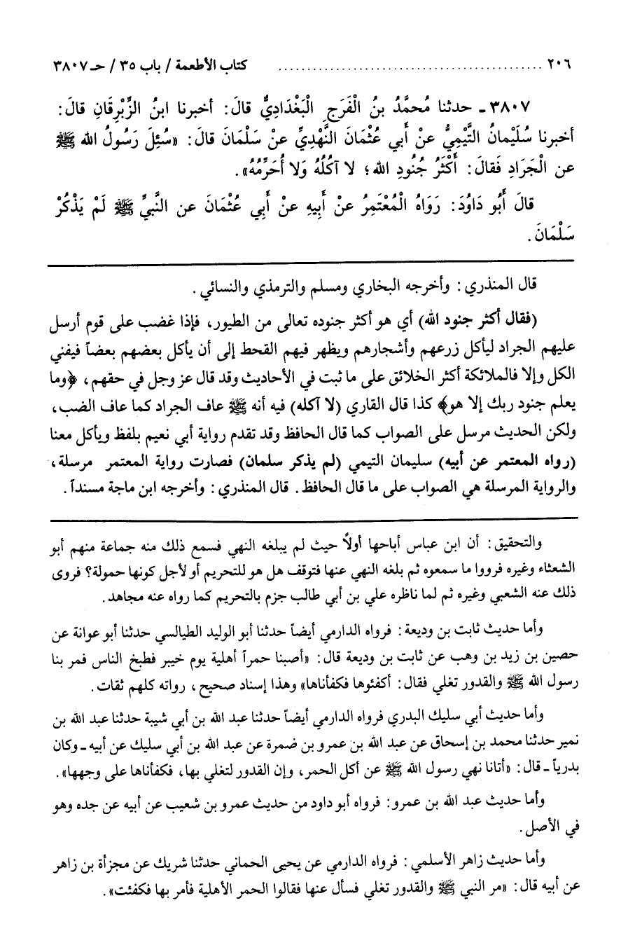 [3813] (فَقَالَ أَكْثَرُ جُنُودِ اللَّهِ) أَيْ هُوَ أَكْثَرُ جُنُودِهِ تَعَالَى مِنَ الطُّيُورِ فَإِذَا غَضِبَ عَلَى قَوْمٍ أَرْسَلَ عَلَيْهِمُ الْجَرَادَ لِيَأْكُلَ زَرْعَهُمْ وَأَشْجَارَهُمْ وَيَظْهَرُ فِيهِمُ الْقَحْطُ إِلَى أَنْ يَأْكُلَ بَعْضُهُمْ بَعْضًا فَيَفْنَى الْكُلُّ وَإِلَّا فَالْمَلَائِكَةُ أَكْثَرُ الْخَلَائِقِ عَلَى مَا ثَبَتَ فِي الْأَحَادِيثِ وَقَدْ قَالَ عزوجل فِي حَقِّهِمْ وَمَا يَعْلَمُ جُنُودَ رَبِّكَ إِلَّا هو كذا قال القارىء (لَا آكُلُهُ) فِيهِ أَنَّهُ صَلَّى اللَّهُ عَلَيْهِ وَسَلَّمَ عَافَ الْجَرَادَ كَمَا عَافَ الضَّبَّ وَلَكِنَّ الْحَدِيثَ مُرْسَلٌ عَلَى الصَّوَابِ كَمَا قَالَ الْحَافِظُ وَقَدْ تَقَدَّمَ رِوَايَةُ أَبِي نُعَيْمٍ بِلَفْظِ وَيَأْكُلُ مَعَنَا (رَوَاهُ الْمُعْتَمِرُ عَنْ أَبِيهِ) سُلَيْمَانُ التَّيْمِيُّ (لم يذكر سلمان) فصارت رِوَايَةُ الْمُعْتَمِرِ مُرْسَلَةً وَالرِّوَايَةُ الْمُرْسَلَةُ هِيَ الصَّوَابُ على ما قال الحافظ قال المنذري وأخرجه بن ماجه