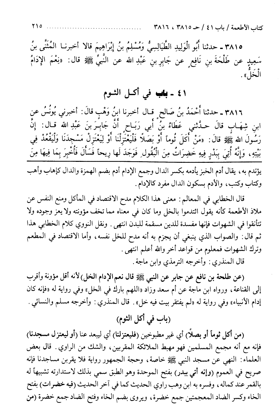 [3821] (عَنْ طَلْحَةَ بْنِ نَافِعٍ عَنْ جَابِرٍ عَنِ النَّبِيِّ صَلَّى اللَّهُ عَلَيْهِ وَسَلَّمَ قَالَ نِعْمَ الْإِدَامُ الْخَلُّ) لِأَنَّهُ أَقَلُّ مُؤْنَةٍ وَأَقْرَبُ إلى القناعة ورواه بن مَاجَهْ عَنْ أُمِّ سَعْدٍ وَزَادَ اللَّهُمَّ بَارِكْ فِي الْخَلِّ وَفِي رِوَايَةٍ لَهُ فَإِنَّهُ كَانَ إِدَامَ الْأَنْبِيَاءِ وَفِي رِوَايَةٍ لَهُ لَمْ يَفْتَقِرْ بيت فيه خلقال الْمُنْذِرِيُّ وَأَخْرَجَهُ مُسْلِمٌ وَالنَّسَائِيُّ