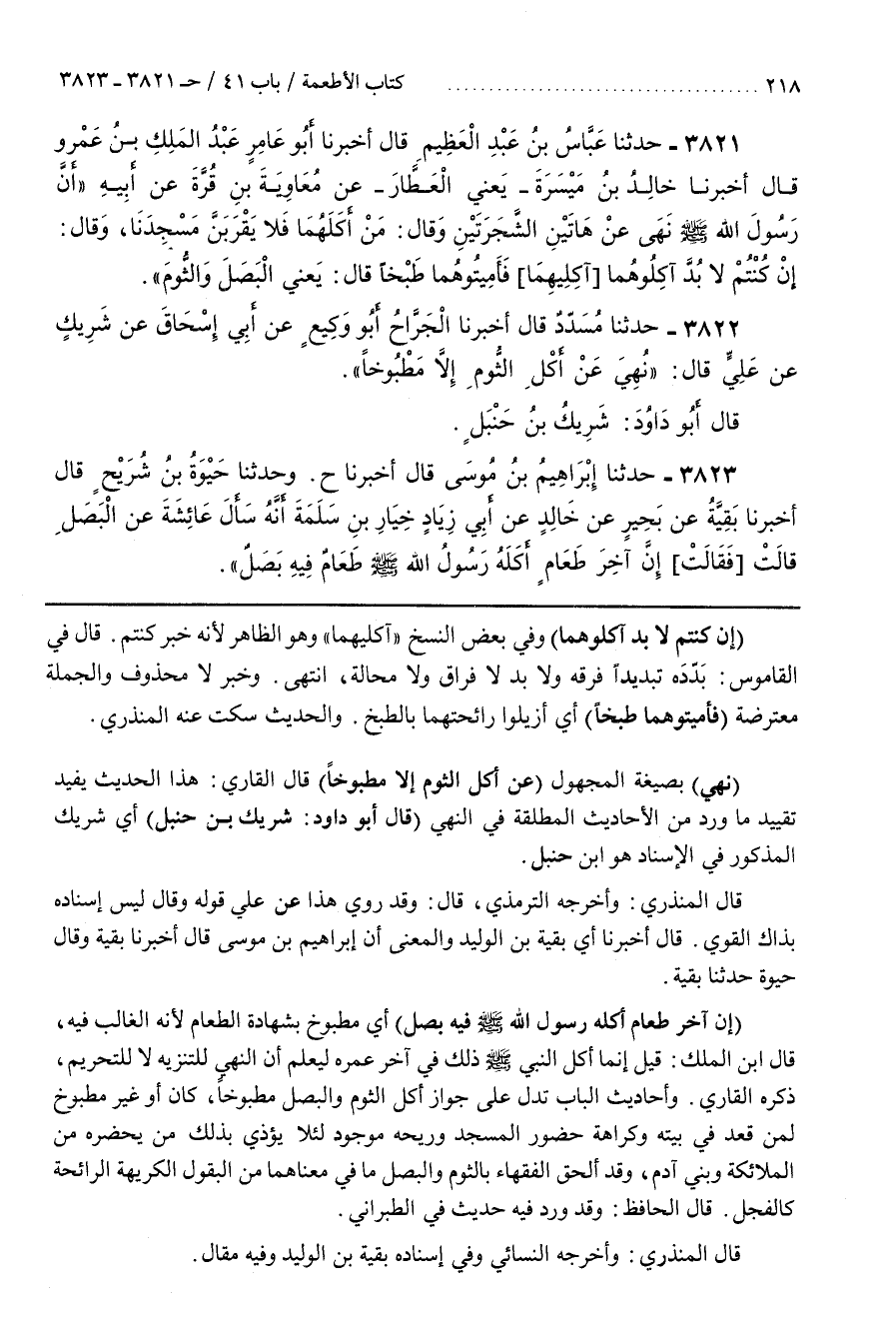 [3828] (نُهِيَ) بِصِيغَةِ الْمَجْهُولِ (عَنْ أَكْلِ الثُّومِ إِلَّا مطبوخا) قال القارىء هَذَا الْحَدِيثُ يُفِيدُ تَقْيِيدَ مَا وَرَدَ مِنَ الْأَحَادِيثِ الْمُطْلَقَةِ فِي النَّهْيِ (قَالَ أَبُو دَاوُدَ شَرِيكُ بْنُ حَنْبَلٍ) أَيْ شَرِيكٌ الْمَذْكُورُ فِي الإسناد هو بن حَنْبَلٍ