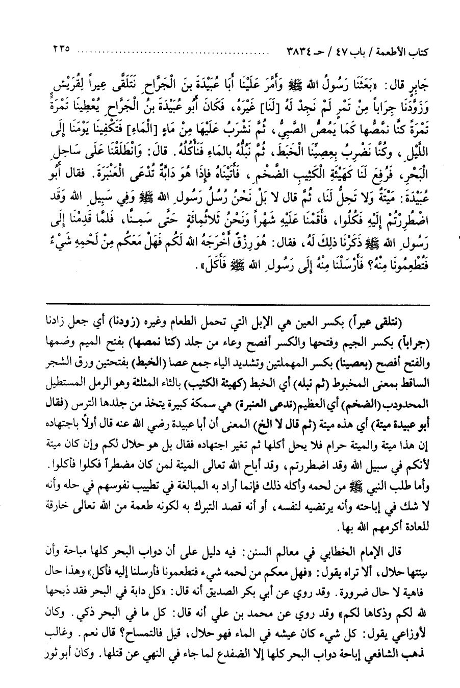 [3840] (نَتَلَقَّى عِيرًا) بِكَسْرِ الْعَيْنِ هِيَ الْإِبِلِ الَّتِي تَحْمِلُ الطَّعَامَ وَغَيْرَهُ (زَوَّدَنَا) أَيْ جَعَلَ زَادَنَا (جِرَابًا) بِكَسْرِ الْجِيمِ وَفَتْحِهَا وَالْكَسْرُ أَفْصَحُ وِعَاءٌ مِنْ جِلْدٍ (كُنَّا نَمَصُّهَا) بِفَتْحِ الْمِيمِ وَضَمِّهَا وَالْفَتْحُ أَفْصَحُ (بِعِصِيِّنَا) بِكَسْرِ الْمُهْمَلَتَيْنِ وَتَشْدِيدِ الْيَاءِ جَمْعُ عَصًا (الْخَبَطَ) بِفَتْحَتَيْنِ وَرَقُ الشَّجَرِ السَّاقِطُ بِمَعْنَى الْمَخْبُوطِ (ثُمَّ نَبُلُّهُ) أَيِ الْخَبَطَ (كَهَيْئَةِ الْكَثِيبِ) بِالثَّاءِ الْمُثَلَّثَةِ وَهُوَ الرَّمْلُ الْمُسْتَطِيلُ الْمَحْدُوبُ (الضَّخْمِ) أي العظيم (تدعى العنبر) هِيَ سَمَكَةٌ كَبِيرَةٌ يُتَّخَذُ مِنْ جِلْدِهَا التُّرْسُ (فَقَالَ أَبُو عُبَيْدَةَ مَيْتَةٌ) أَيْ هَذِهِ مَيْتَةٌ (ثُمَّ قَالَ لَا إِلَخْ) الْمَعْنَى أَنَّ أَبَا عُبَيْدَةَ رَضِيَ اللَّهُ عَنْهُ قَالَ أَوَّلًا بِاجْتِهَادِهِ إِنَّ هَذَا مَيْتَةٌ وَالْمَيْتَةُ حَرَامٌ فَلَا يَحِلُّ أَكْلُهَا ثُمَّ تَغَيَّرَ اجْتِهَادُهُ فَقَالَ بَلْ هُوَ حَلَالٌ لَكُمْ وَإِنْ كَانَ مَيْتَةً لِأَنَّكُمْ فِي سَبِيلِ اللَّهِ وَقَدِ اضْطُرِرْتُمْ وَقَدْ أَبَاحَ اللَّهُ تَعَالَى الْمَيْتَةَ لِمَنْ كَانَ مُضْطَرًّا فَكُلُوا فَأَكَلُوا