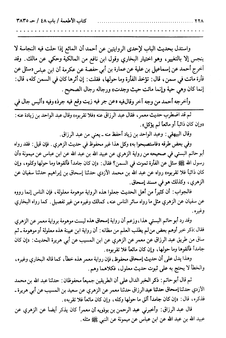 وَقَدْ أَخْرَجَ أَحْمَدُ عَنْ إِسْمَاعِيلَ بْنِ عُلَيَّةَ عَنْ عُمَارَةَ بْنِ أَبِي حَفْصَةَ عَنْ عِكْرِمَةَ أَنَّ بن عَبَّاسٍ سُئِلَ عَنْ فَأْرَةٍ مَاتَتْ فِي سَمْنٍ قَالَ تُؤْخَذُ الْفَأْرَةُ وَمَا حَوْلَهَا فَقُلْتُ إِنَّ أَثَرَهَا كَانَ فِي السَّمْنِ كُلِّهِ قَالَ إِنَّمَا كان وهي حية وإنما مَاتَتْ حَيْثُ وُجِدَتْ وَرِجَالُهُ رِجَالُ الصَّحِيحِ