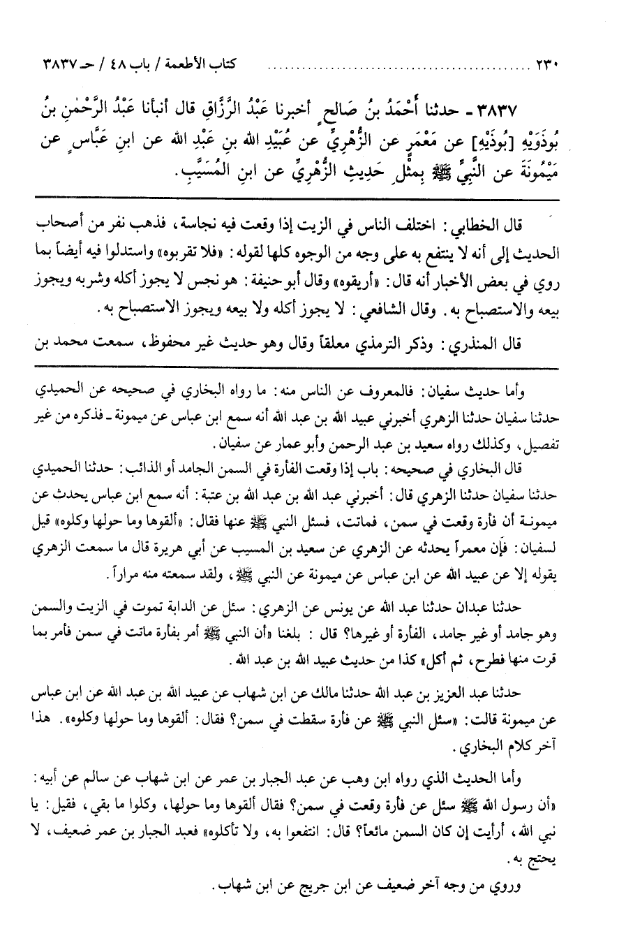 قَالَ الْخَطَّابِيُّ اخْتَلَفَ النَّاسُ فِي الزَّيْتِ إِذَا وَقَعَتْ فِيهِ نَجَاسَةٌ فَذَهَبَ نَفَرٌ مِنْ أَصْحَابِ الْحَدِيثِ إِلَى أَنَّهُ لَا يُنْتَفَعُ بِهِ عَلَى وَجْهٍ مِنَ الْوُجُوهِ كُلِّهَا لِقَوْلِهِ فَلَا تَقْرَبُوهُ وَاسْتَدَلُّوا فِيهِ أَيْضًا بِمَا رُوِيَ فِي بَعْضِ الْأَخْبَارِ أَنَّهُ قَالَ أَرِيقُوهُ وَقَالَ أَبُو حَنِيفَةَ هُوَ نَجِسٌ لَا يَجُوزُ أَكْلُهُ وَشُرْبُهُ وَيَجُوزُ بَيْعُهُ وَالِاسْتِصْبَاحُ بِهِ