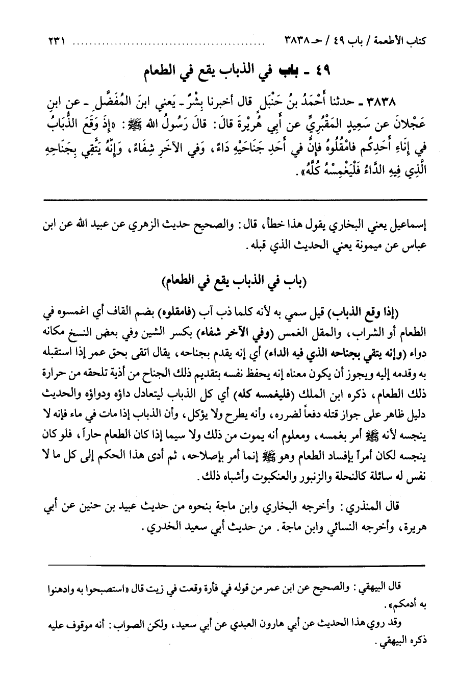 [3844] (إِذَا وَقَعَ الذُّبَابُ) قِيلَ سُمِّيَ بِهِ لِأَنَّهُ كُلَّمَا ذُبَّ آبَ (فَامْقُلُوهُ) بِضَمِّ الْقَافِ أَيْ اغْمِسُوهُ فِي الطَّعَامِ أَوِ الشَّرَابِ وَالْمَقْلُ الْغَمْسُ (وَفِي الْآخَرِ شِفَاءٌ) بِكَسْرِ الشِّينِ وَفِي بَعْضِ النُّسَخِ مَكَانَهُ دَوَاءٌ (وَإِنَّهُ يَتَّقِي بِجَنَاحِهِ الَّذِي فِيهَا الدَّاءُ) أَيْ إِنَّهُ يُقَدِّمُ بِجَنَاحِهِ يُقَالُ اتَّقَى بِحَقِّ عُمَرَ إِذَا اسْتَقْبَلَهُ بِهِ وَقَدَّمَهُ إِلَيْهِ وَيَجُوزُ أَنْ يَكُونَ مَعْنَاهُ إِنَّهُ يَحْفَظُ نَفْسَهُ بِتَقْدِيمِ ذَلِكَ الْجَنَاحِ مِنْ أَذِيَّةٍ تَلْحَقُهُ مِنْ حرارة ذلك الطعام ذكره بن الْمَلَكِ (فَلْيَغْمِسْهُ) أَيْ كُلَّ الذُّبَابِ لِيَتَعَادَلَ دَاؤُهُ وَدَوَاؤُهُ وَالْحَدِيثُ دَلِيلٌ ظَاهِرٌ عَلَى جَوَازِ قَتْلِهِ دَفْعًا لِضَرَرِهِ وَأَنَّهُ يُطْرَحُ وَلَا يُؤْكَلُ وَأَنَّ الذُّبَابَ إِذَا مَاتَ فِي مَاءٍ فَإِنَّهُ لَا يُنَجِّسُهُ لِأَنَّهُ صَلَّى اللَّهُ عَلَيْهِ وَسَلَّمَ أَمَرَ بِغَمْسِهِ وَمَعْلُومٌ أَنَّهُ يَمُوتُ مِنْ ذَلِكَ وَلَا سِيَّمَا إِذَا كَانَ الطَّعَامُ حَارًّا فَلَوْ كَانَ ينجسه لكان أمرا بإفساد الطعام وهو صلى الله عليه وسلم إِنَّمَا أَمَرَ بِإِصْلَاحِهِ ثُمَّ أَدَّى هَذَا الْحُكْمُ إلى كل مالا نَفْسَ لَهُ سَائِلَةٌ كَالنَّحْلَةِ وَالزُّنْبُورِ وَالْعَنْكَبُوتِ وَأَشْبَاهِ ذلك