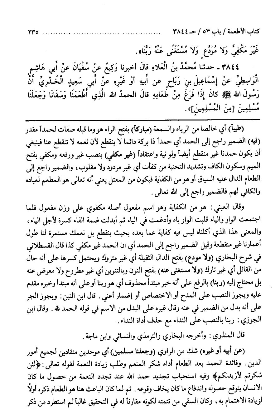 قَالَ الْعَيْنِيُّ هُوَ مِنَ الْكِفَايَةِ وَهُوَ اسْمُ مَفْعُولٍ أَصْلُهُ مَكْفُويٍّ عَلَى وَزْنِ مَفْعُولٍ فَلَمَّا اجْتَمَعَتِ الْوَاوُ وَالْيَاءُ قُلِبَتِ الْوَاوُ يَاءً وَأُدْغِمَتْ فِي الْيَاءِ ثُمَّ أُبْدِلَتْ ضَمَّةُ الْفَاءِ كَسْرَةً لِأَجْلِ الْيَاءِ وَالْمَعْنَى هَذَا الَّذِي أَكَلْنَاهُ لَيْسَ فِيهِ كِفَايَةٌ عَمَّا بَعْدَهُ بِحَيْثُ يَنْقَطِعُ بَلْ نِعَمُكَ مُسْتَمِرَّةٌ لَنَا طُولَ أَعْمَارِنَا غَيْرُ مُنْقَطِعَةٍ وَقِيلَ الضَّمِيرُ رَاجِعٌ إِلَى الْحَمْدِ أَيْ أَنَّ الْحَمْدَ غَيْرُ مَكْفِيٍّ إِلَخْ كَذَا قَالَ الْقَسْطَلَّانِيُّ فِي شَرْحِ الْبُخَارِيِّ (وَلَا مُوَدَّعٍ) بِفَتْحِ الدَّالِ الثَّقِيلَةِ أَيْ غَيْرُ مَتْرُوكٍ وَيُحْتَمَلُ كَسْرُهَا عَلَى أَنَّهُ حَالٌ مِنَ الْقَائِلِ أَيْ غَيْرُ تَارِكٍ (وَلَا مُسْتَغَنًى عَنْهُ) بِفَتْحِ النُّونِ وَبِالتَّنْوِينِ أَيْ غَيْرُ مَطْرُوحٍ وَلَا مُعْرَضَ عَنْهُ بَلْ مُحْتَاجٌ إِلَيْهِ (رَبُّنَا) بِالرَّفْعِ عَلَى أَنَّهُ خَبَرُ مُبْتَدَأٍ مَحْذُوفٍ أَيْ هُوَ رَبُّنَا أو على أنه مبتدأ وخبر مُقَدَّمٌ عَلَيْهِ وَيَجُوزُ النَّصْبُ عَلَى الْمَدْحِ أَوِ الاختصاص أو إضمارا عني