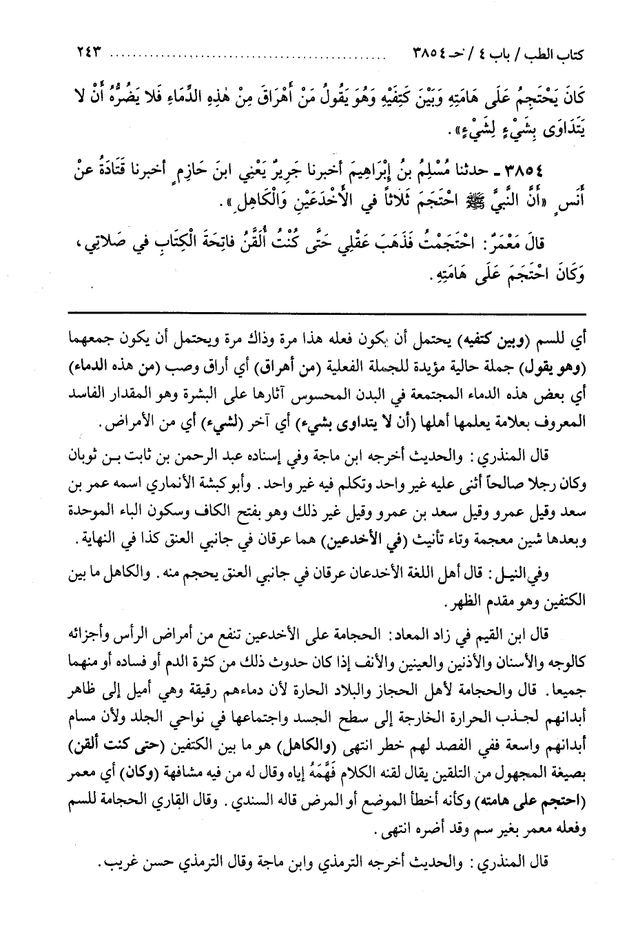 قَالَ وَالْحِجَامَةُ لِأَهْلِ الْحِجَازِ وَالْبِلَادِ الْحَارَّةِ لِأَنَّ دِمَاءَهُمْ رَقِيقَةٌ وَهِيَ أَمْيَلُ إِلَى ظَاهِرِ أَبْدَانِهِمْ لِجَذْبِ الْحَرَارَةِ الْخَارِجَةِ إِلَى سَطْحِ الْجَسَدِ وَاجْتِمَاعِهَا فِي نَوَاحِي الْجِلْدِ وَلِأَنَّ مَسَامَّ أَبْدَانِهِمْ وَاسِعَةٌ فَفِي الْفَصْدِ لَهُمْ خَطَرٌ انْتَهَى (وَالْكَاهِلُ) هُوَ مَا بَيْنَ الْكَتِفَيْنِ (حَتَّى كُنْتُ أُلَقَّنُ) بِصِيغَةِ الْمَجْهُولِ مِنَ التَّلْقِينِ يُقَالُ لَقَّنَهُ الْكَلَامَ فَهَّمَهُ إِيَّاهُ وَقَالَ لَهُ مِنْ فِيهِ مُشَافَهَةً (وَكَانَ) أَيْ مَعْمَرٌ (احْتَجَمَ عَلَى هَامَتِهِ) وَكَأَنَّهُ أَخْطَأَ الْمَوْضِعَ أَوِ الْمَرَضَ قَالَهُ السِّنْدِيُّ