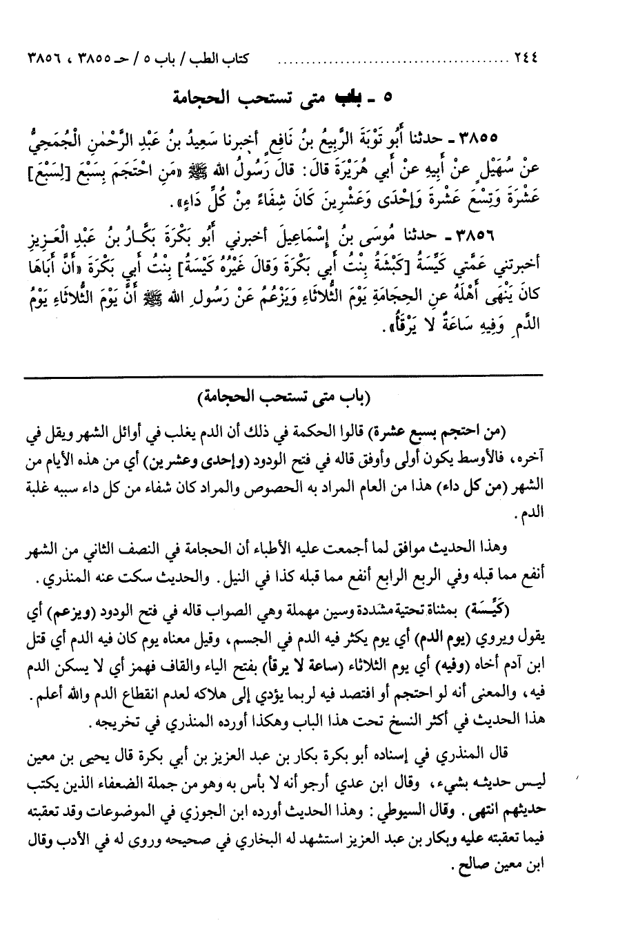 [3861] (من احتجم بسبع عَشْرَةَ) قَالُوا الْحِكْمَةُ فِي ذَلِكَ أَنَّ الدَّمَ يَغْلِبُ فِي أَوَائِلِ الشَّهْرِ وَيَقِلُّ فِي آخِرِهِ فَالْأَوْسَطُ يَكُونُ أَوْلَى وَأَوْفَقَ قَالَهُ فِي فَتْحِ الْوَدُودِ (وَإِحْدَى وَعِشْرِينَ) أَيْ مِنْ هَذِهِ الْأَيَّامِ مِنَ الشَّهْرِ (مِنْ كُلِّ دَاءٍ) هَذَا مِنَ الْعَامِّ الْمُرَادُ بِهِ الْخُصُوصُ وَالْمُرَادُ كَانَ شِفَاءً مِنْ كُلِّ دَاءٍ سَبَبُهُ غَلَبَةُ الدَّمِ