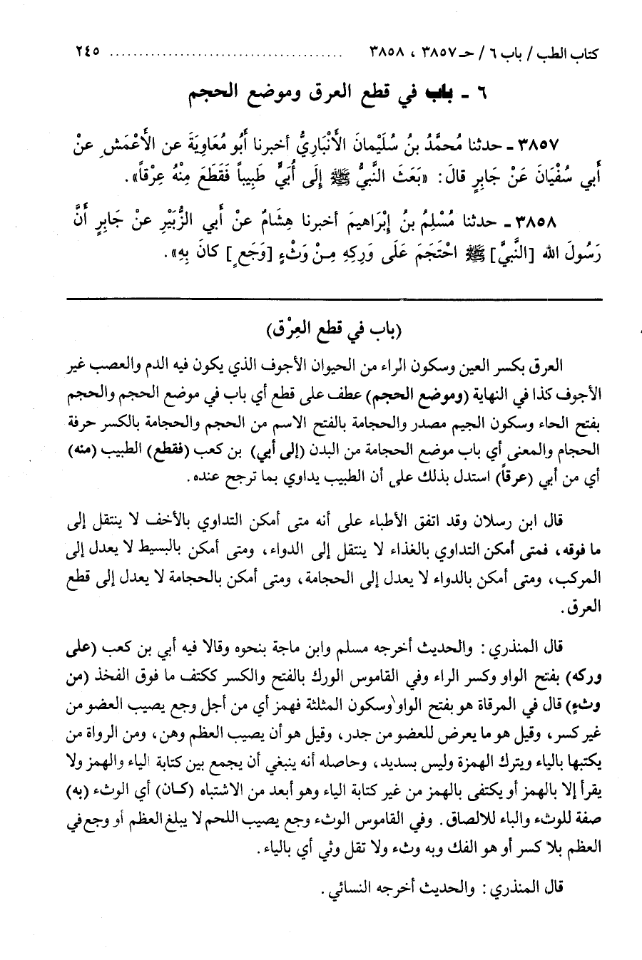 [3864] الْعِرْقُ بِكَسْرِ الْعَيْنِ وَسُكُونِ الرَّاءِ مِنَ الْحَيَوَانِ الْأَجْوَفُ الَّذِي يَكُونُ فِيهِ الدَّمُ وَالْعَصَبُ غَيْرُ الْأَجْوَفِ كَذَا فِي النِّهَايَةِ (وَمَوْضِعِ الْحَجْمِ) عَطْفٌ عَلَى قَطْعِ أَيْ بَابٌ فِي مَوْضِعِ الْحَجْمِ بِفَتْحِ الْحَاءِ وَسُكُونِ الْجِيمِ مَصْدَرٌ وَالْحَجَامَةُ بِالْفَتْحِ الِاسْمُ مِنَ الْحَجْمِ وَالْحِجَامَةُ بِالْكَسْرِ حِرْفَةُ الْحَجَّامِ وَالْمَعْنَى أَيْ بَابُ مَوْضِعِ الْحِجَامَةِ مِنَ الْبَدَنِ