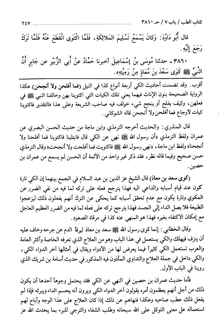 [3866] (كَوَى سَعْدَ بْنَ مُعَاذٍ) قَالَ الشَّيْخُ عِزُّ الدِّينِ بْنُ عَبْدِ السَّلَامِ فِي الْجَمْعِ بَيْنَهُمَا أَنَّ الْكَيَّ تَارَةً يَكُونُ عِنْدَ قِيَامِ أَسْبَابِهِ وَالدَّاعِي إِلَيْهِ فَهَذَا يَتَرَجَّحُ فِعْلُهُ عَلَى تَرْكِهِ لِمَا فِيهِ مِنْ نَفْيِ الضَّرَرِ عَنِ الْمَكْوِيِّ وَتَارَةً يَكُونُ مَعَ عَدَمِ تَحَقُّقِ أَسْبَابِهِ كَمَا يُحْكَى عَنِ التُّرْكِ أَنَّهُمْ يَفْعَلُونَ ذَلِكَ لِيُزْعِجُوا الطَّبِيعَةَ فَلَا يَصِلُ الدَّاءُ إِلَى الْجَسَدِ فَهَذَا يَتَرَجَّحُ تَرْكُهُ عَلَى فِعْلِهِ لِمَا فِيهِ مِنَ الضَّرَرِ الْعَظِيمِ الْعَاجِلِ مَعَ إِمْكَانِ الِاكْتِفَاءِ بِغَيْرِهِ فَهَذَا هُوَ الْمَنْهِيُّ عَنْهُ كَذَا فِي مِرْقَاةِ الصُّعُودِ