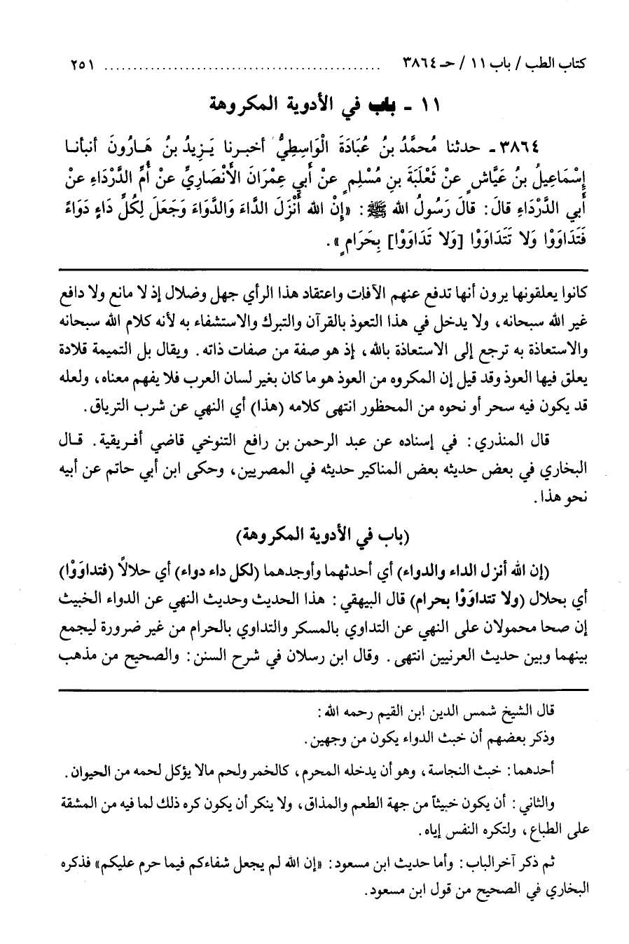 (إِنَّ اللَّهَ أَنْزَلَ الدَّاءَ وَالدَّوَاءَ) أَيْ أَحْدَثَهُمَا وَأَوْجَدَهُمَا (لِكُلِّ دَاءٍ دَوَاءٌ) أَيْ حَلَالًا (فَتَدَاوَوْا) أَيْ بِحَلَالٍ (وَلَا تَتَدَاوَوْا بِحَرَامٍ) قَالَ الْبَيْهَقِيُّ هَذَا الْحَدِيثُ وَحَدِيثُ النَّهْيِ عَنِ الدَّوَاءِ الْخَبِيثِ إِنْ صَحَّا مَحْمُولَانِ عَلَى النَّهْيِ عَنِ التَّدَاوِيِ بِالْمُسْكِرِ وَالتَّدَاوِي بِالْحَرَامِ مِنْ غَيْرِ ضَرُورَةٍ لِيَجْمَعَ بَيْنَهُمَا وَبَيْنَ حَدِيثِ الْعُرَنِيِّينَ انتهى
