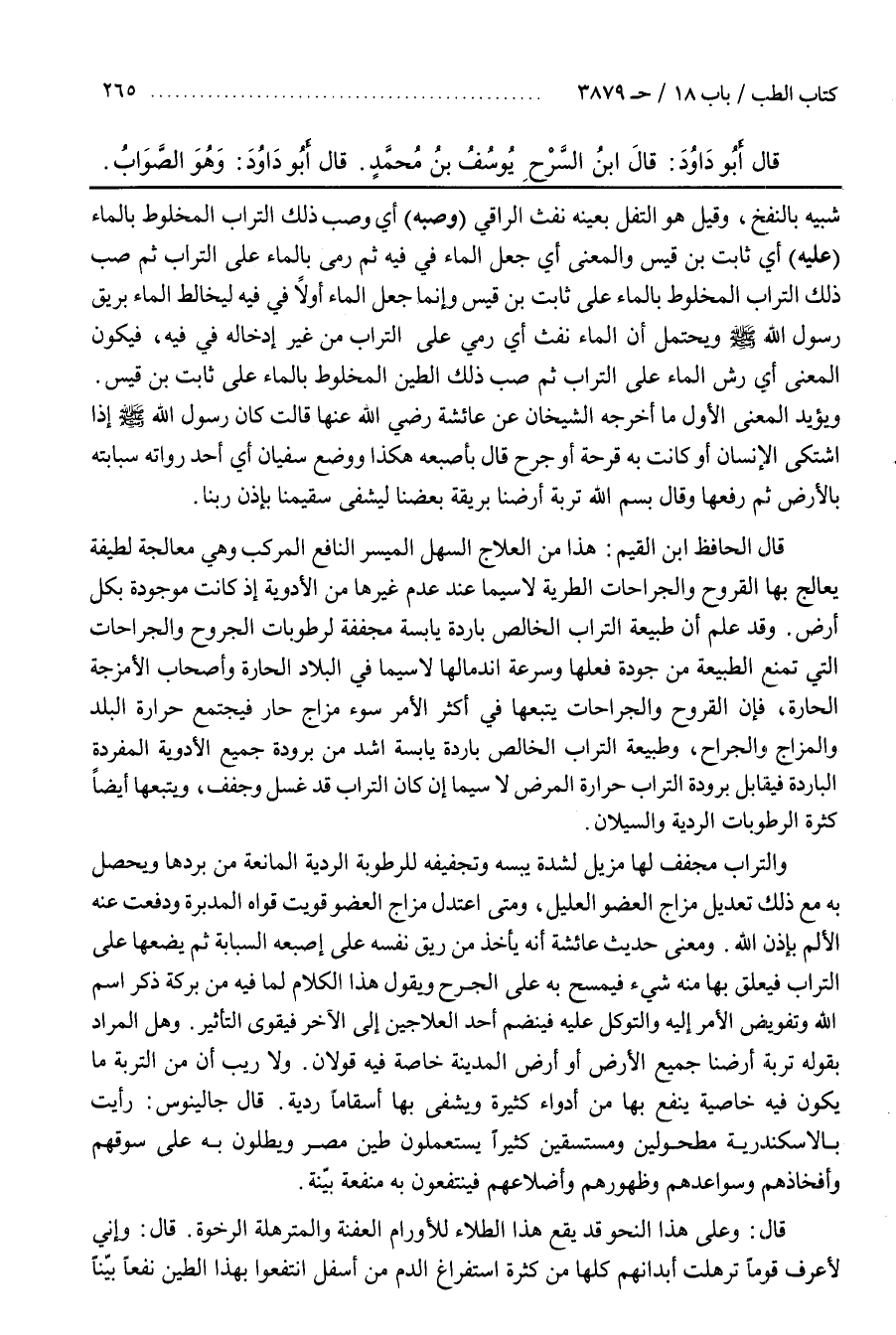 وَقَدْ عُلِمَ أَنَّ طَبِيعَةَ التُّرَابِ الْخَالِصِ بَارِدَةٌ يَابِسَةٌ مُجَفِّفَةٌ لِرُطُوبَاتِ الْجُرُوحِ وَالْجِرَاحَاتِ الَّتِي تَمْنَعُ الطَّبِيعَةُ مِنْ جَوْدَةِ فِعْلِهَا وَسُرْعَةِ انْدِمَالِهَا لَا سِيَّمَا فِي الْبِلَادِ الْحَارَّةِ وَأَصْحَابِ الْأَمْزِجَةِ الْحَارَّةِ فَإِنَّ الْقُرُوحَ وَالْجِرَاحَاتِ يَتْبَعُهَا فِي أَكْثَرِ الْأَمْرِ سُوءُ مِزَاجٍ حَارٍّ فَيَجْتَمِعُ حَرَارَةُ الْبَلَدِ وَالْمِزَاجِ وَالْجِرَاحِ وَطَبِيعَةُ التُّرَابِ الْخَالِصِ بَارِدَةٌ يَابِسَةٌ أَشَدُّ مِنْ بُرُودَةِ جَمِيعِ الْأَدْوِيَةِ الْمُفْرَدَةِ الْبَارِدَةِ فَيُقَابِلُ بُرُودَةُ التُّرَابِ حَرَارَةَ الْمَرَضِ لَا سِيَّمَا إِنْ كَانَ التُّرَابُ قَدْ غُسِلَ وَجُفِّفَ وَيَتْبَعُهَا أَيْضًا كَثْرَةُ الرُّطُوبَاتِ الرَّدِيَّةِ وَالسَّيْلَانِ