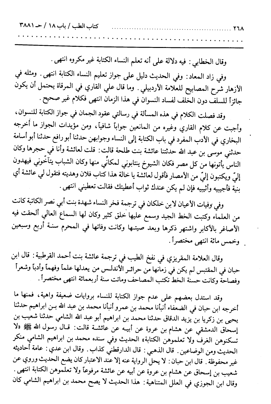 وَقَدِ اسْتَدَلَّ بَعْضُهُمْ عَلَى عَدَمِ جَوَازِ الْكِتَابَةِ لِلنِّسَاءِ بروايات ضعيفة واهية فمنها ما أخرجه بن حِبَّانَ فِي الضُّعَفَاءِ أَنْبَأَنَا مُحَمَّدُ بْنُ عَمْرٍو أَنْبَأَنَا مُحَمَّدُ بْنُ عَبْدِ اللَّهِ بْنِ إِبْرَاهِيمَ حَدَّثَنَا يَحْيَى بْنُ زَكَرِيَّا بْنِ يَزِيدَ الدَّقَّاقُ حَدَّثَنَا مُحَمَّدُ بْنُ إِبْرَاهِيمَ أَبُو عَبْدِ اللَّهِ الشَّامِيُّ حَدَّثَنَا شُعَيْبُ بْنُ إِسْحَاقَ الدِّمَشْقِيُّ عَنْ هِشَامِ بْنِ عُرْوَةَ عَنْ أَبِيهِ عَنْ عَائِشَةَ قالت قال رسول الله لَا تُسْكِنُوهُنَّ الْغُرَفَ وَلَا تُعَلِّمُوهُنَّ الْكِتَابَةَ الْحَدِيثَ وَفِي سَنَدِهِ مُحَمَّدُ بْنُ إِبْرَاهِيمَ الشَّامِيُّ مُنْكَرُ الْحَدِيثِ وَمِنَ الْوَضَّاعِينَ