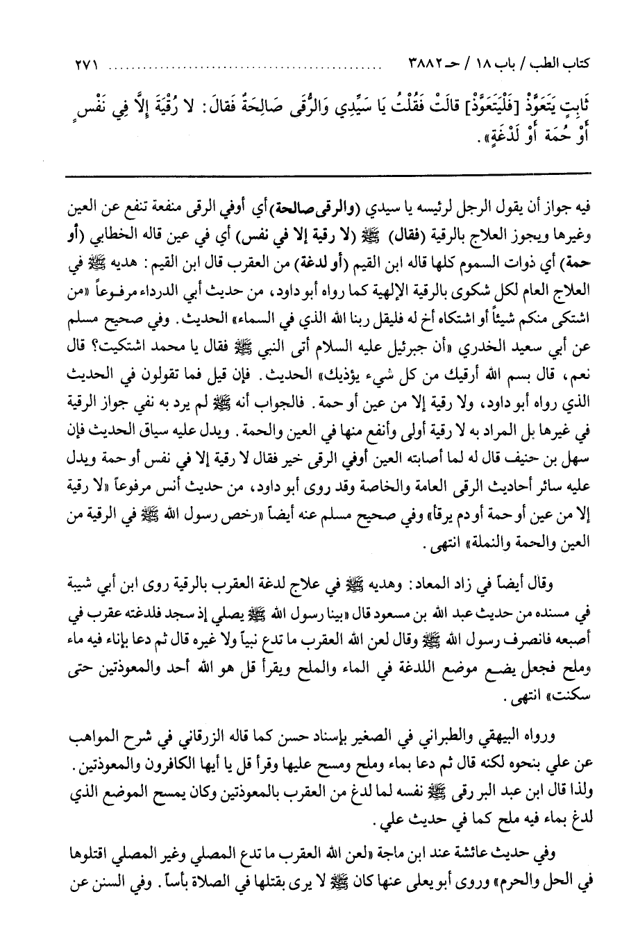 وقال أيضا في زاد المعاد وهدية في علاج لدغة العقرب بالرقية روى بن أَبِي شَيْبَةَ فِي مُسْنَدِهِ مِنْ حَدِيثِ عَبْدِ اللَّهِ بْنِ مَسْعُودٍ قَالَ بَيْنَا رَسُولُ اللَّهِ يُصَلِّي إِذْ سَجَدَ فَلَدَغَتْهُ عَقْرَبٌ فِي أُصْبُعِهِ فانصرف رسول الله وَقَالَ لَعَنَ اللَّهُ الْعَقْرَبَ مَا تَدَعُ نَبِيًّا وَلَا غَيْرَهُ قَالَ ثُمَّ دَعَا بِإِنَاءٍ فِيهِ مَاءٌ وَمِلْحٌ فَجَعَلَ يَضَعُ مَوْضِعَ اللَّدْغَةِ فِي الْمَاءِ وَالْمِلْحِ وَيَقْرَأُ قُلْ هُوَ اللَّهُ أَحَدٌ وَالْمُعَوِّذَتَيْنِ حَتَّى سَكَنَتْ انْتَهَى