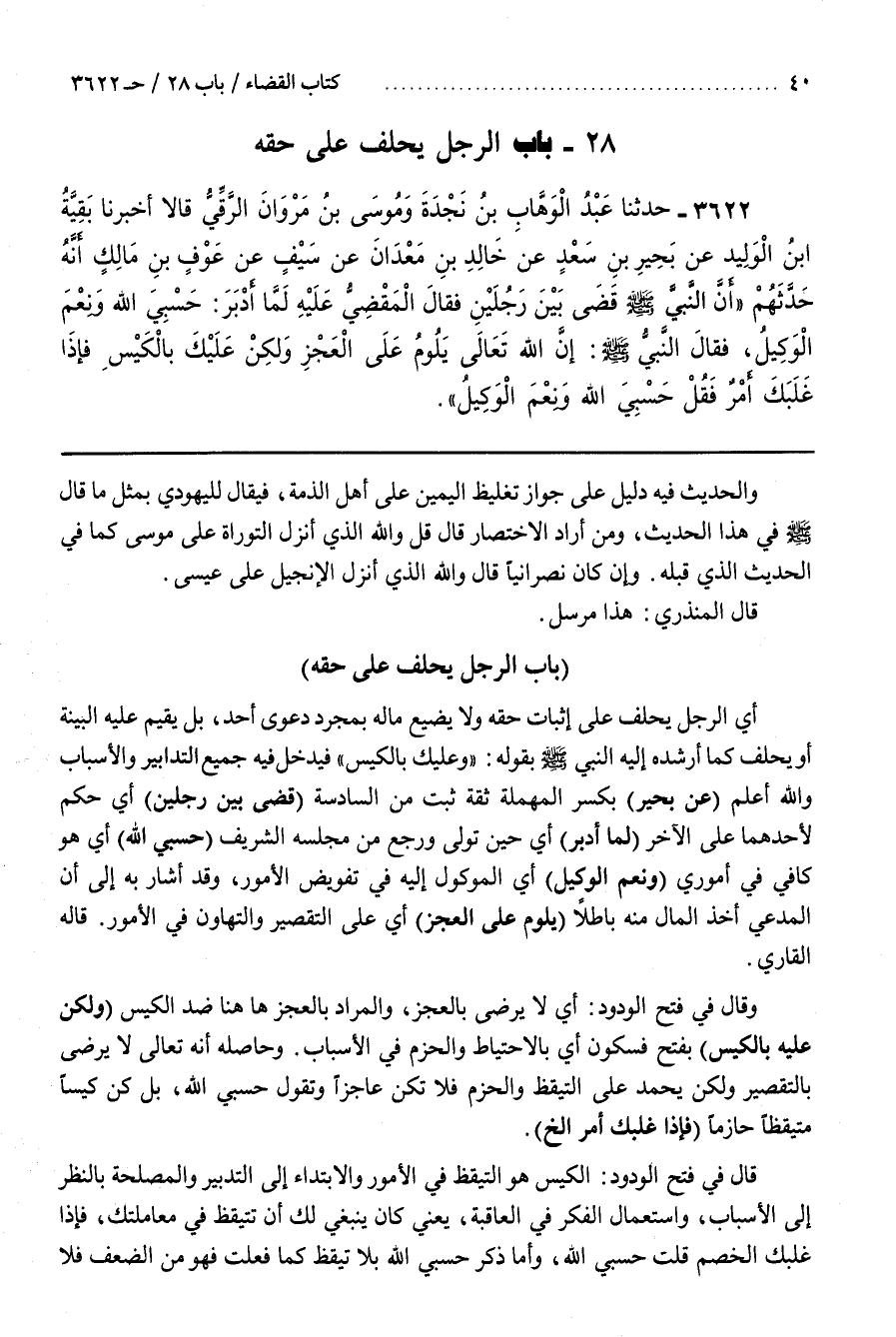 (عَنْ بَحِيرِ) بِكَسْرِ الْمُهْمَلَةِ ثِقَةٌ ثَبْتٌ مِنَ السَّادِسَةِ (قَضَى بَيْنَ رَجُلَيْنِ) أَيْ حَكَمَ لِأَحَدِهِمَا عَلَى الْآخَرِ (لَمَّا أَدْبَرَ) أَيْ حِينَ تَوَلَّى وَرَجَعَ مِنْ مَجْلِسِهِ الشَّرِيفِ (حَسْبِيَ اللَّهُ) أَيْ هُوَ كَافِي فِي أُمُورِي (وَنِعْمَ الْوَكِيلُ) أَيِ الْمَوْكُولُ إِلَيْهِ فِي تَفْوِيضِ الْأُمُورِ وَقَدْ أَشَارَ بِهِ إِلَى أَنَّ الْمُدَّعِي أَخَذَ الْمَالَ مِنْهُ بَاطِلًا (يَلُومُ عَلَى الْعَجْزِ) أَيْ عَلَى التَّقْصِيرِ وَالتَّهَاوُنِ فِي الْأُمُورِ