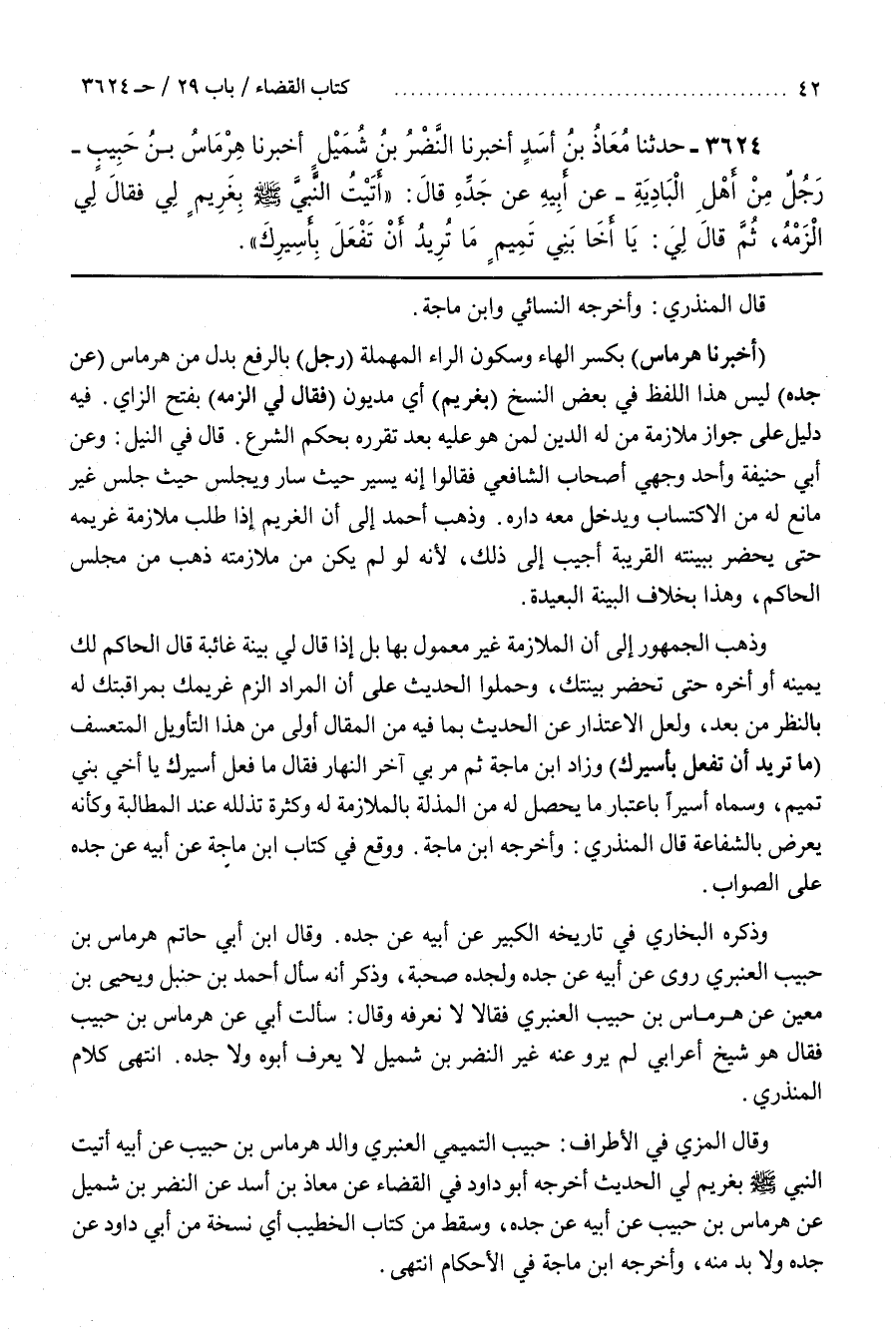 [3629] (أَخْبَرَنَا هِرْمَاسُ) بِكَسْرِ الْهَاءِ وَسُكُونِ الرَّاءِ الْمُهْمَلَةِ (رَجُلٌ) بِالرَّفْعِ بَدَلٌ مِنْ هِرْمَاسُ (عَنْ جَدِّهِ) لَيْسَ هَذَا اللَّفْظُ فِي بَعْضِ النُّسَخِ (بِغَرِيمٍ) أَيْ مَدْيُونٍ (فَقَالَ لِي الْزَمْهُ) بِفَتْحِ الزَّايِ