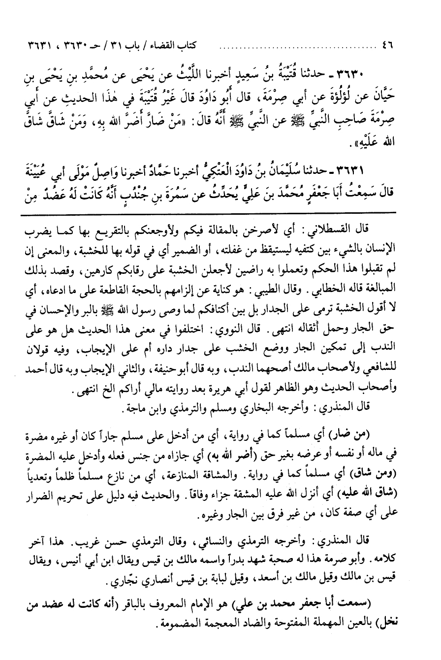 [3635] (مَنْ ضَارَّ) أَيْ مُسْلِمًا كَمَا فِي رِوَايَةٍ أَيْ مَنْ أَدْخَلَ عَلَى مُسْلِمٍ جَارًا كَانَ أَوْ غَيْرَهُ مَضَرَّةً فِي مَالِهِ أَوْ نَفْسِهِ أَوْ عِرْضِهِ بِغَيْرِ حَقٍّ (أَضَرَّ اللَّهُ بِهِ) أَيْ جَازَاهُ مِنْ جِنْسِ فِعْلِهِ وَأَدْخَلَ عَلَيْهِ الْمَضَرَّةَ (وَمَنْ شَاقَّ) أَيْ مُسْلِمًا كَمَا فِي رِوَايَةٍ