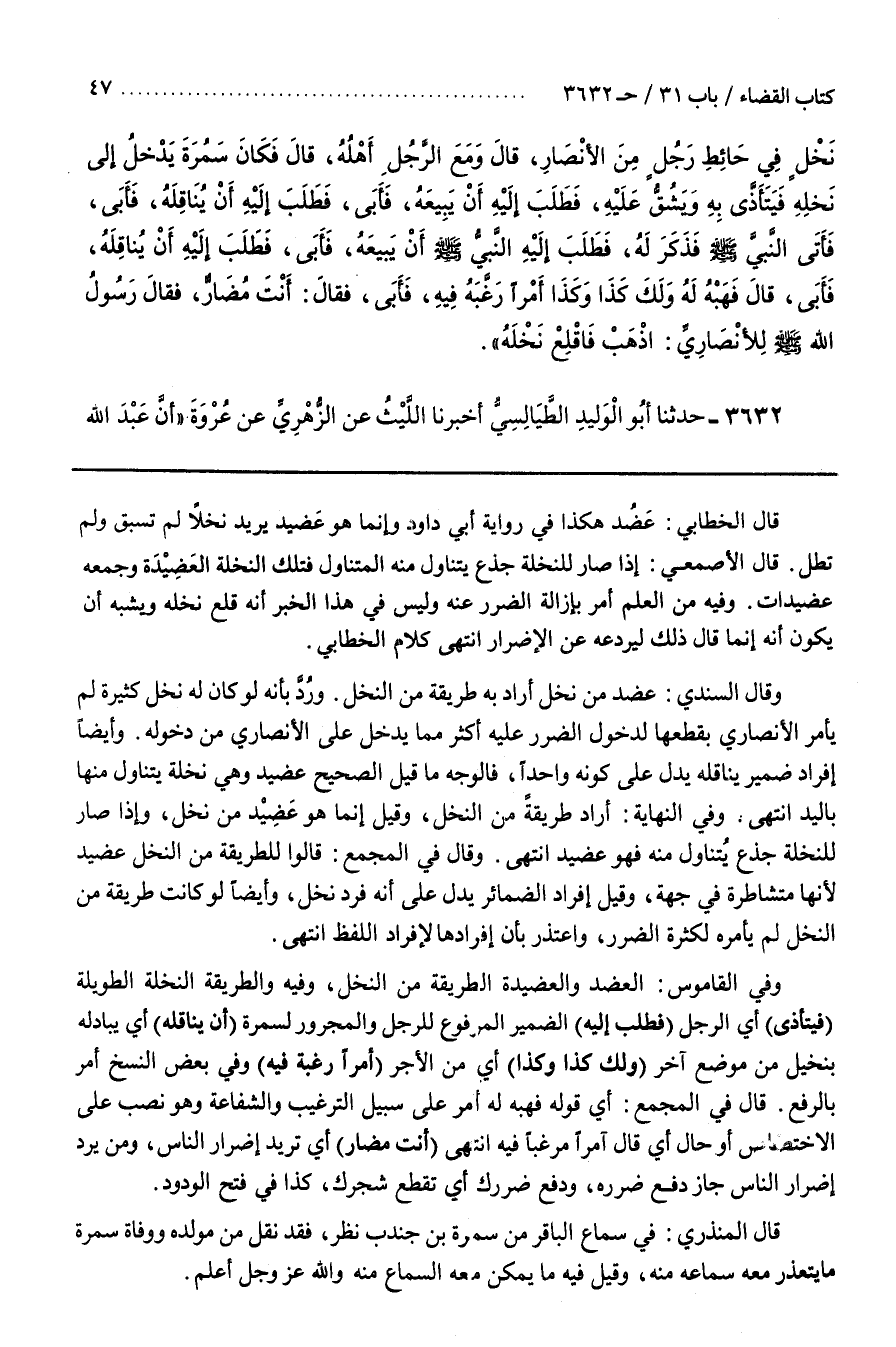 وَقَالَ السِّنْدِيُّ عَضُدٌ مِنْ نَخْلٍ أَرَادَ بِهِ طَرِيقَةً مِنَ النَّخْلِ وَرُدَّ بِأَنَّهُ لَوْ كَانَ لَهُ نَخْلٌ كَثِيرَةٌ لَمْ يَأْمُرِ الْأَنْصَارِيَّ بِقَطْعِهَا لِدُخُولِ الضَّرَرِ عَلَيْهِ أَكْثَرَ مِمَّا يَدْخُلُ عَلَى الْأَنْصَارِيِّ مِنْ دُخُولِهِ