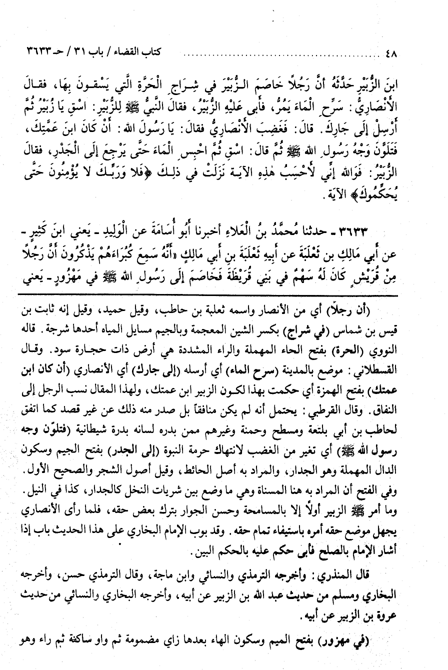 [3637] (أَنَّ رَجُلًا) أَيْ مِنَ الْأَنْصَارِ وَاسْمُهُ ثَعْلَبَةُ بْنُ حَاطِبٍ وَقِيلَ حُمَيْدٌ وَقِيلَ إِنَّهُ ثَابِتُ بْنُ قَيْسِ بْنِ شَمَّاسٍ (فِي شِرَاجِ) بِكَسْرِ الشِّينِ الْمُعْجَمَةِ وَبِالْجِيمِ مَسَايِلُ الْمِيَاهِ أَحَدُهَا شَرْجَةٌ