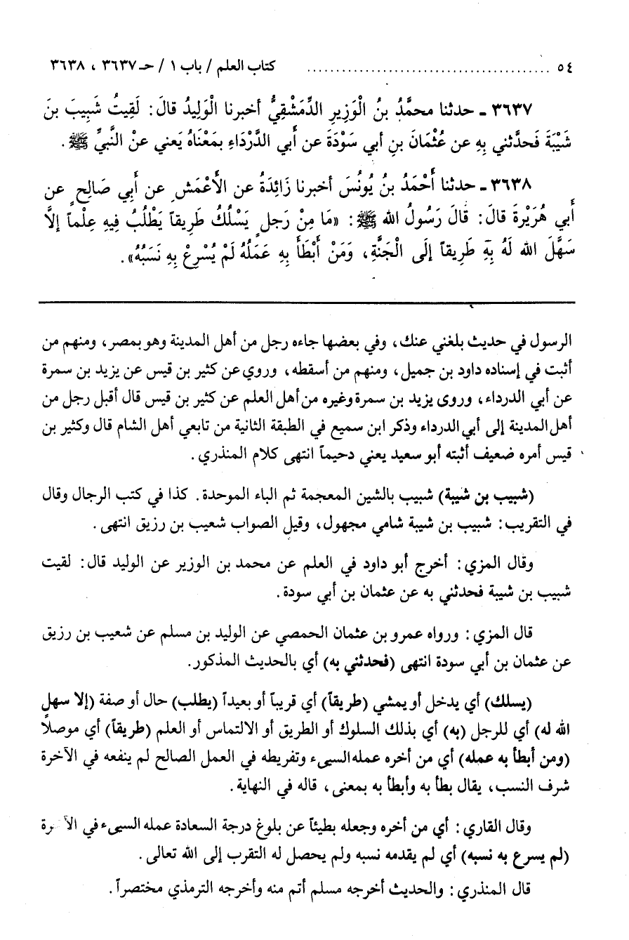 [3643] (يَسْلُكُ) أَيْ يَدْخُلُ أَوْ يَمْشِي (طَرِيقًا) أَيْ قَرِيبًا أَوْ بَعِيدًا (يَطْلُبُ) حَالٌ أَوْ صِفَةٌ (إِلَّا سَهَّلَ اللَّهُ لَهُ) أَيْ لِلرَّجُلِ (بِهِ) أَيْ بِذَلِكَ السُّلُوكِ أَوِ الطَّرِيقِ أَوِ الِالْتِمَاسِ أَوِ الْعِلْمِ (طَرِيقًا) أَيْ مُوَصِّلًا (وَمَنْ أَبْطَأَ عَمَلُهُ) أَيْ مَنْ أَخَّرَهُ عَمَلُهُ السَّيِّئُ وَتَفْرِيطُهُ فِي الْعَمَلِ الصَّالِحِ لَمْ يَنْفَعْهُ فِي الْآخِرَةِ شَرَفُ النَّسَبِ يُقَالُ بَطَّأَ بِهِ وَأَبْطَأَ بِهِ بِمَعْنًى قَالَهُ فِي النِّهَايَةِ