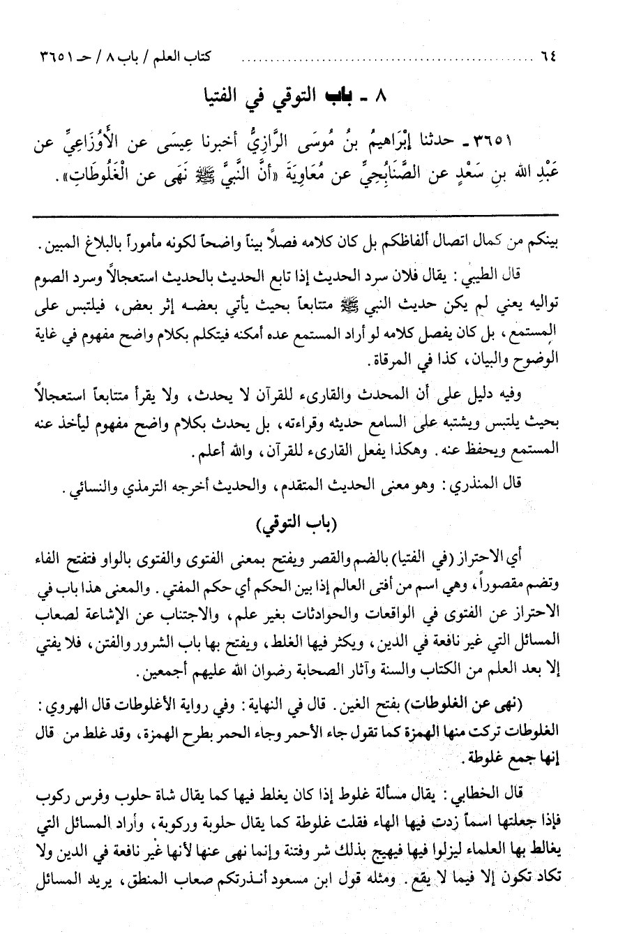 وَالْمَعْنَى هَذَا بَابٌ فِي الِاحْتِرَازِ عَنِ الْفَتْوَى فِي الْوَاقِعَاتِ وَالْحَوَادِثَاتِ بِغَيْرِ عِلْمٍ وَالِاجْتِنَابِ عَنِ الْإِشَاعَةِ لِصِعَابِ الْمَسَائِلِ الَّتِي غَيْرُ نَافِعَةٍ فِي الدِّينِ وَيَكْثُرُ فِيهَا الْغَلَطُ وَيُفْتَحُ بِهَا بَابُ الشُّرُورِ وَالْفِتَنِ فَلَا يُفْتِي إِلَّا بَعْدَ الْعِلْمِ مِنَ الْكِتَابِ وَالسُّنَّةِ وَآثَارِ الصَّحَابَةِ رِضْوَانُ اللَّهِ عَلَيْهِمْ أَجْمَعِينَ