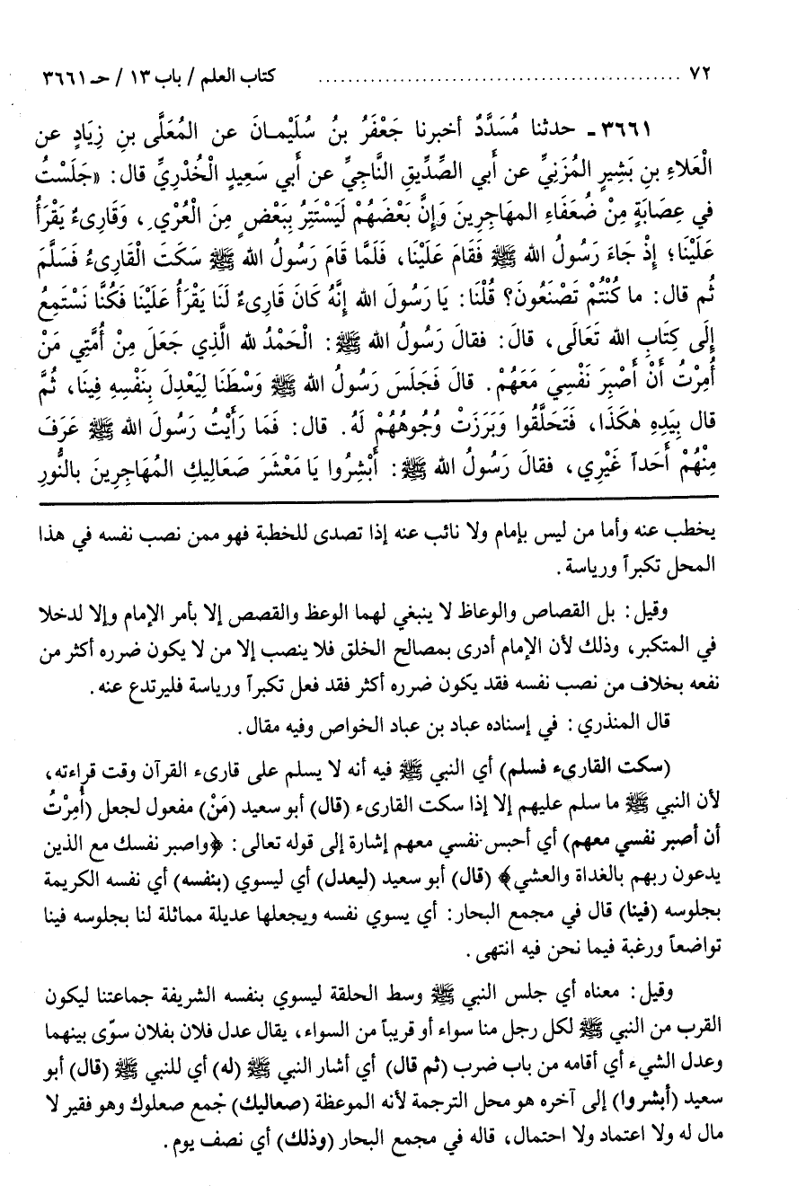 [3666] (سَكَتَ الْقَارِئُ فَسَلَّمَ) أَيِ النَّبِيُّ صَلَّى اللَّهُ عَلَيْهِ وَسَلَّمَ فِيهِ أَنَّهُ لَا يُسَلَّمُ عَلَى قَارِئِ الْقُرْآنِ وَقْتَ قِرَاءَتِهِ لِأَنَّ النَّبِيَّ صَلَّى اللَّهُ عَلَيْهِ وَسَلَّمَ مَا سَلَّمَ عَلَيْهِمْ إِلَّا إِذَا سكت القارئ (قال) أبو سعيد (مَنْ) مَفْعُولٌ لِجَعَلَ (أُمِرْتُ أَنْ أَصْبِرَ نَفْسِيَ مَعَهُمْ) أَيْ أَحْبِسَ نَفْسِي مَعَهُمْ إِشَارَةً إِلَى قَوْلِهِ تَعَالَى وَاصْبِرْ نَفْسَكَ مَعَ الَّذِينَ يَدْعُونَ ربهم بالغداة والعشي (قَالَ) أَبُو سَعِيدٍ (لِيَعْدِلَ) أَيْ لِيُسَوِّيَ (بِنَفْسِهِ) أَيْ نَفْسِهِ الْكَرِيمَةِ بِجُلُوسِهِ (فِينَا) قَالَ فِي مَجْمَعِ الْبِحَارِ أَيْ يُسَوِّي نَفْسَهُ وَيَجْعَلُهَا عَدِيلَةً مُمَاثِلَةً لَنَا بِجُلُوسِهِ فِينَا تَوَاضُعًا وَرَغْبَةً فِيمَا نَحْنُ فِيهِ انْتَهَى