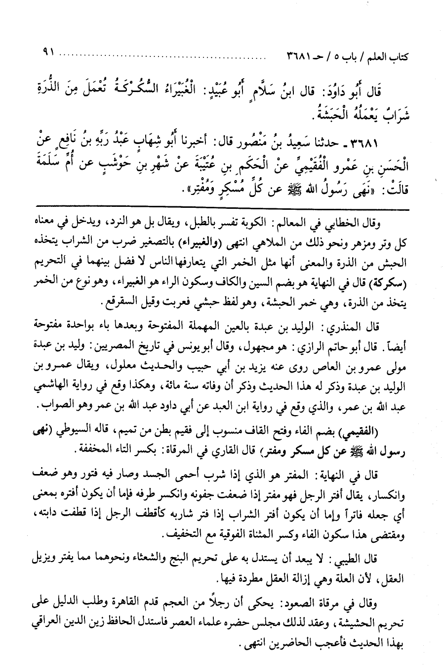 وَقَالَ فِي مِرْقَاةِ الصُّعُودِ يُحْكَى أَنَّ رَجُلًا مِنَ الْعَجَمِ قَدِمَ الْقَاهِرَةَ وَطَلَبَ الدَّلِيلَ عَلَى تَحْرِيمِ الْحَشِيشَةِ وَعُقِدَ لِذَلِكَ مَجْلِسٌ حَضَرَهُ عُلَمَاءُ الْعَصْرِ فَاسْتَدَلَّ الْحَافِظُ زَيْنُ الدِّينِ الْعِرَاقِيُّ بِهَذَا الْحَدِيثِ فَأَعْجَبَ الْحَاضِرِينَ انْتَهَى