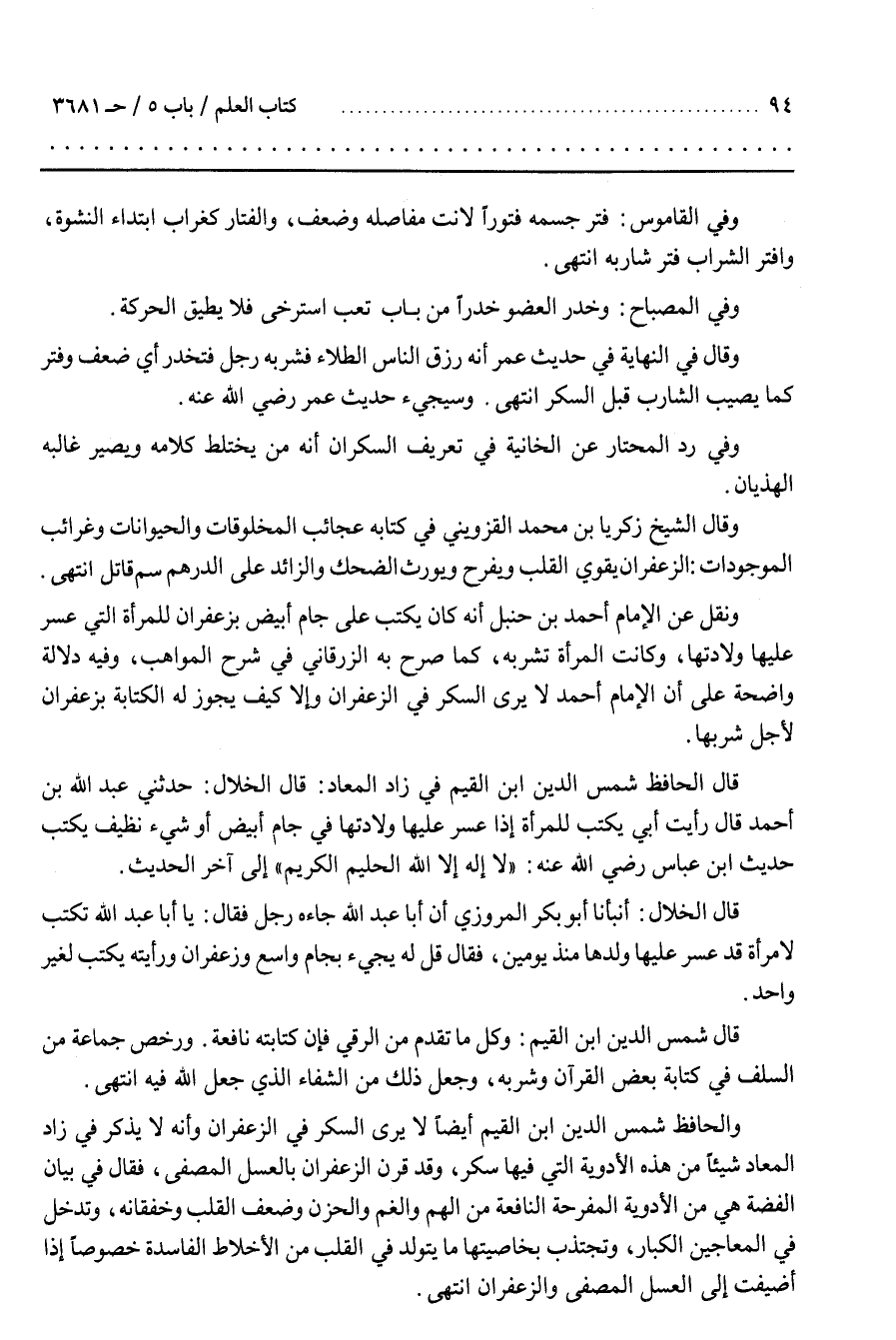 وَالْحَافِظُ بن الْقَيِّمِ أَيْضًا لَا يَرَى السُّكْرَ فِي الزَّعْفَرَانِ وَأَنَّهُ لَا يَذْكُرُ فِي زَادِ الْمَعَادِ شَيْئًا مِنْ هَذِهِ الْأَدْوِيَةِ الَّتِي فِيهَا سُكْرٌ وَقَدْ قَرَنَ الزَّعْفَرَانَ بِالْعَسَلِ الْمُصَفَّى فَقَالَ فِي بَيَانِ الْفِضَّةِ هِيَ مِنَ الْأَدْوِيَةِ الْمُفْرِحَةِ النَّافِعَةِ مِنَ الْهَمِّ وَالْغَمِّ وَالْحَزَنِ وَضَعْفِ الْقَلْبِ وَخَفَقَانِهِ وَتَدْخُلُ فِي الْمَعَاجِينِ الْكِبَارِ وَتَجْتَذِبُ بِخَاصِّيَّتِهَا مَا يَتَوَلَّدُ فِي الْقَلْبِ مِنَ الْأَخْلَاطِ الْفَاسِدَةِ خُصُوصًا إِذَا أُضِيفَتْ إِلَى الْعَسَلِ الْمُصَفَّى وَالزَّعْفَرَانِ انْتَهَى