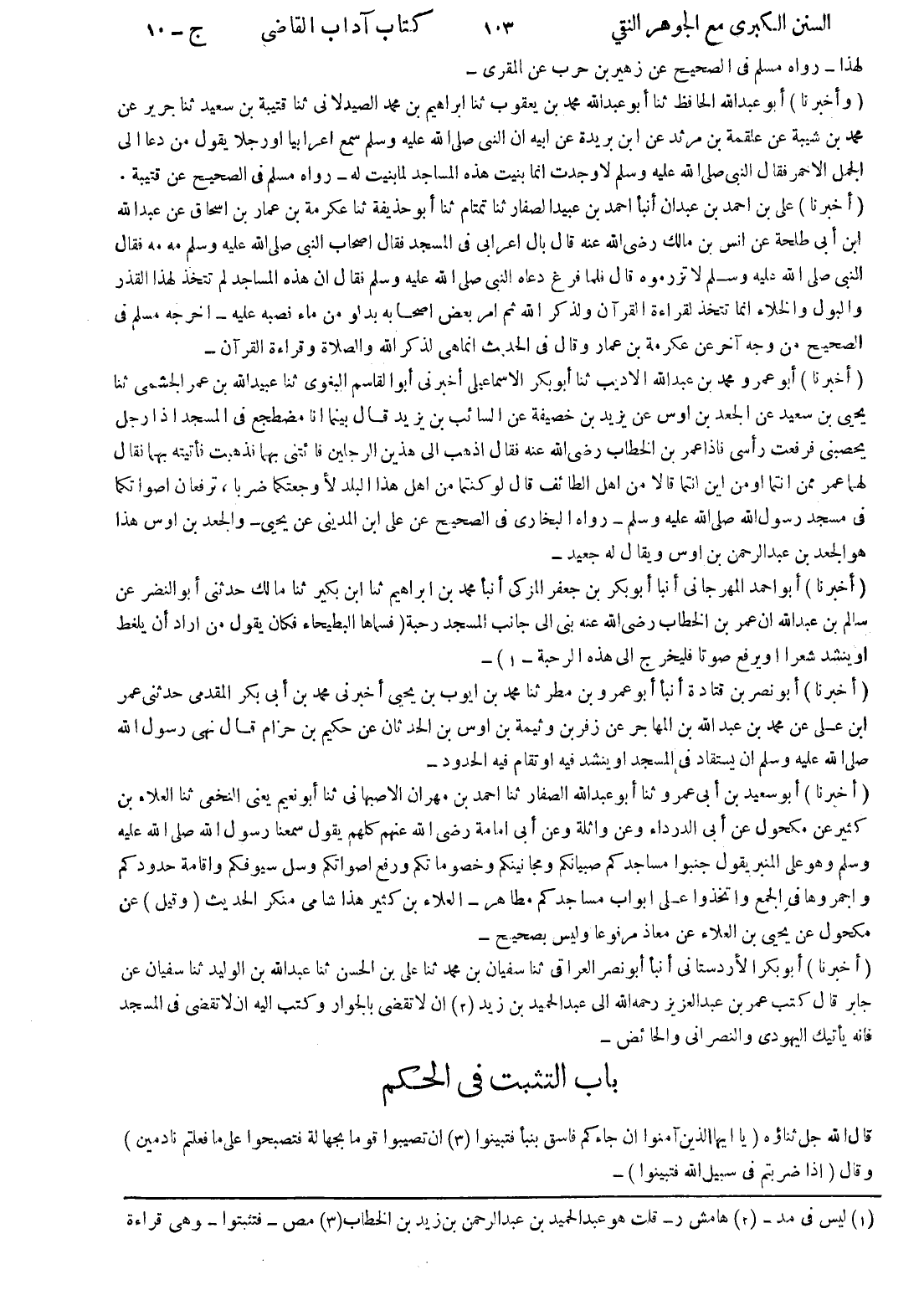 (أخبرنا) أبو بكر الاردستانى أنبأ أبو نصر العراقى ثنا سفيان بن محمد ثنا على بن الحسن ثنا عبد الله بن الوليد ثنا سفيان عن جابر قال كتب عمر بن عبد العزيز رحمه الله إلى عبد الحميد بن زيد (2) ان لا تقضى بالجوار وكتب إليه ان لا تقضى في المسجد فانه يأتيك اليهودي والنصراني والحائض باب التثبت في الحكم قال الله جل ثناؤه (يا ايها الذين آمنوا ان جاءكم فاسق بنبأ فتبينوا (3) ان تصيبوا قوما بجهالة فتصبحوا على ما فعلتم نادمين) وقال (إذا ضربتم في سبيل الله فتبينوا) -