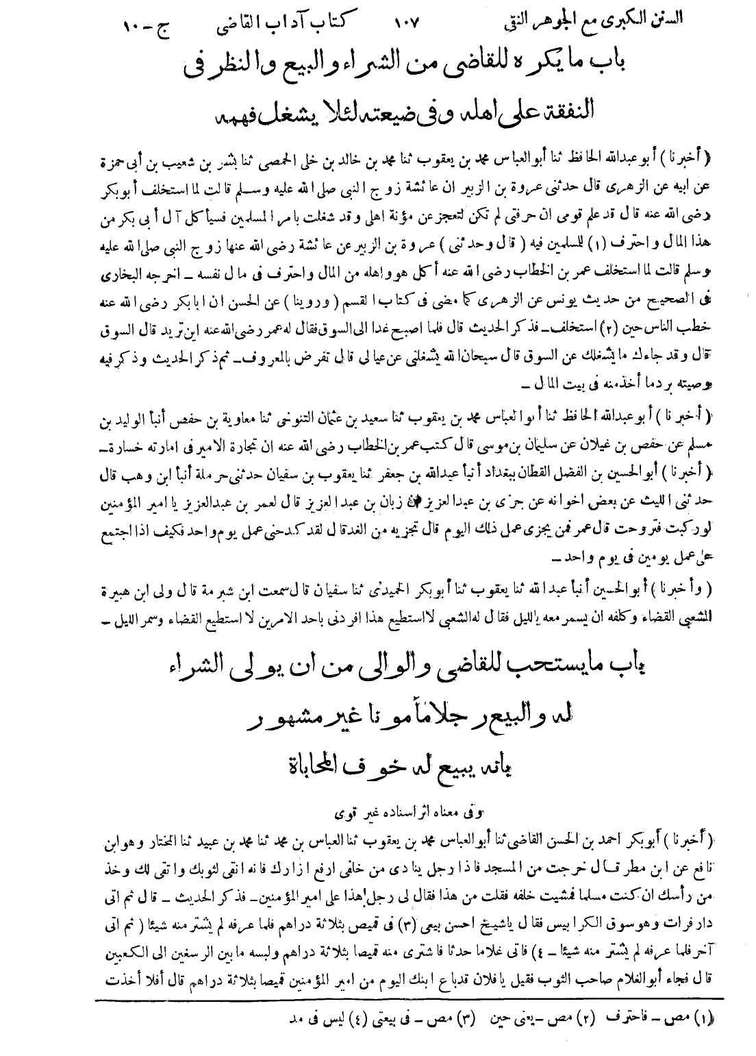 - باب ما يستحب للقاضى والوالى من أن يولى الشراء له والبيع رجلا مأمونا غير مشهور بأنه يبيع له خوف المحاباة وفي معناه اثر اسناده غير قوى