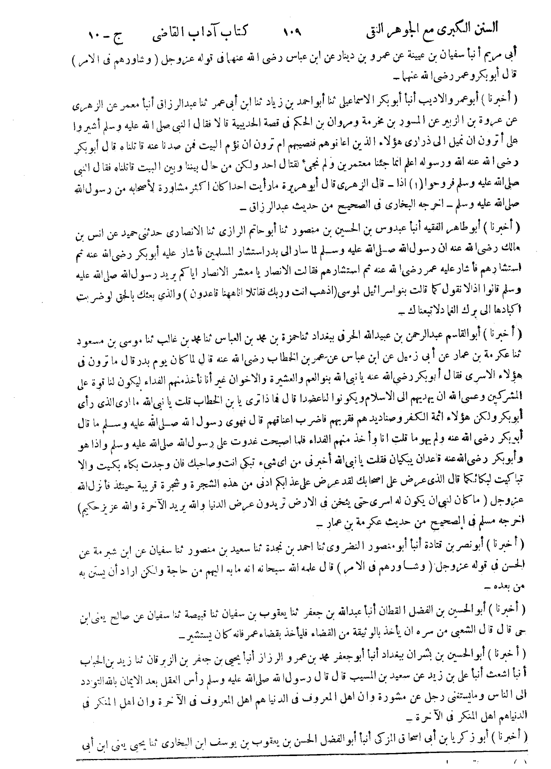 (أخبرنا) أبو نصر بن قتادة أنبأ أبو منصور النضروى ثنا احمد بن نجدة ثنا سعيد بن منصور ثنا سفيان عن ابن شبرمة عن الحسن في قوله عز وجل (وشاورهم في الامر) قال علمه الله سبحانه انه ما به إليهم من حاجة ولكن اراد أن يستن به من بعده