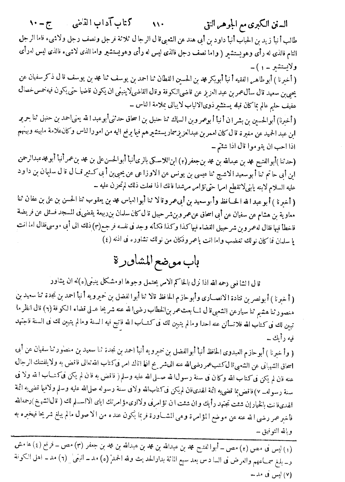 (أخبرنا) أبو نصر بن قتادة الانصاري وأبو حازم الحافظ قالا ثنا أبو الفضل بن خميرويه أنبأ احمد بن نجدة ثنا سعيد بن منصور ثنا هشيم ثنا سيار عن الشعبى قال لما بعث عمر بن الخطاب رضى الله عنه شريحا على قضاء الكوفة (6) قال انظر ما تبين لك في كتاب الله فلا تسألن عنه احدا وما لم يتبين لك في كتاب الله فاتبع فيه السنة وما يتبين لك في السنة فاجتهد فيه رأيك (وأخبرنا) أبو حازم العبدوى الحافظ أنبأ أبو الفضل بن خميرويه أنبأ احمد بن نجدة ثنا سعيد بن منصور ثنا سفيان عن أبى اسحاق الشيباني عن الشعبى قال كتب عمر رضى الله عنه إلى شريح إذا اتاك امر في كتاب الله تعالى فاقض به ولا يلفتنك الرجال
