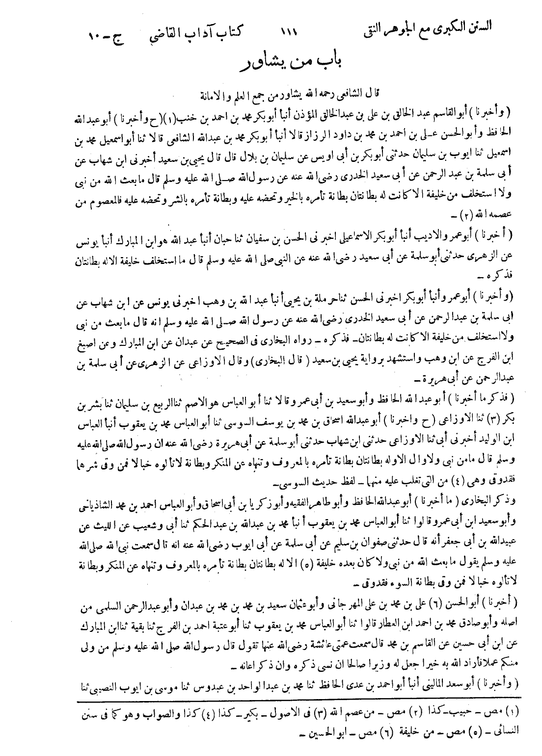 باب من يشاور قال الشافعي رحمه الله يشاور من جمع العلم والامانة (وأخبرنا) أبو القاسم عبد الخالق بن على بن عبد الخالق المؤذن أنبأ أبو بكر محمد بن احمد بن خنب (1)