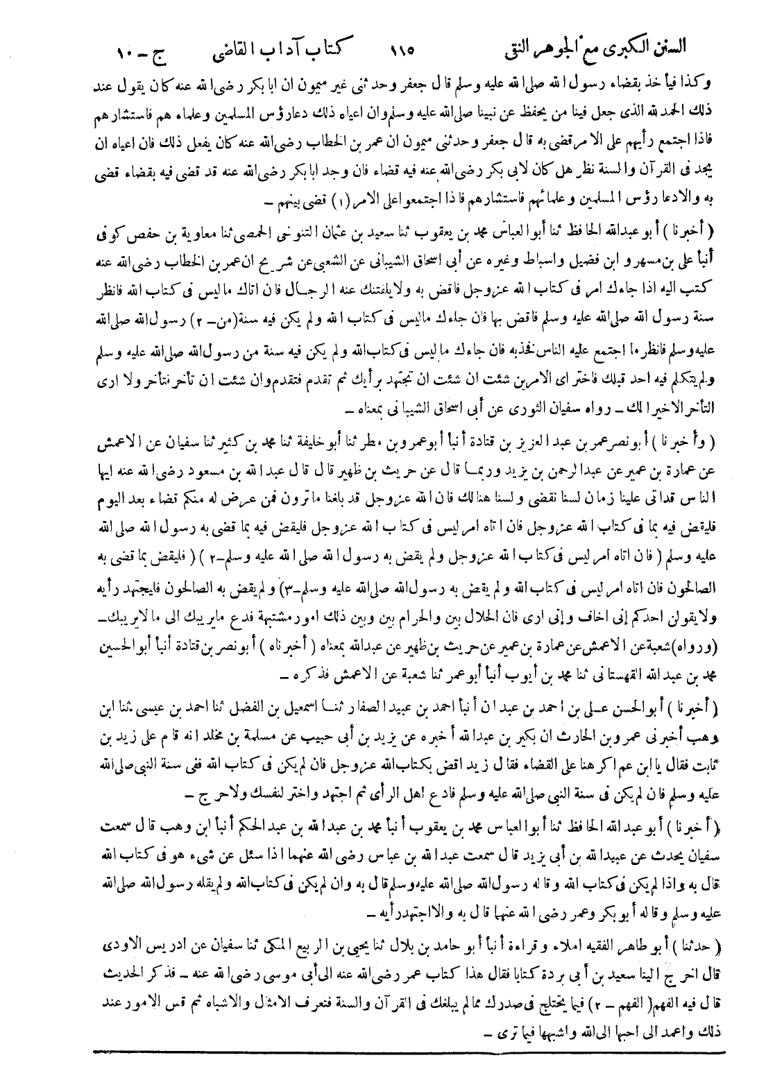 (أخبرنا) أبو عبد الله الحافظ ثنا أبو العباس محمد بن يعقوب ثنا سعيد بن عثمان التنوخى الحمصى ثنا معاوية بن حفص كوفى أنبأ على بن مسهر وابن فضيل واسباط وغيره عن أبى اسحاق الشيباني عن الشعبى عن شريح ان عمر بن الخطاب رضى الله عنه كتب إليه إذا جاءك امر في كتاب الله عز وجل فاقض به ولا يلفتنك عنه الرجال فان اتاك ما ليس في كتاب الله فانظر