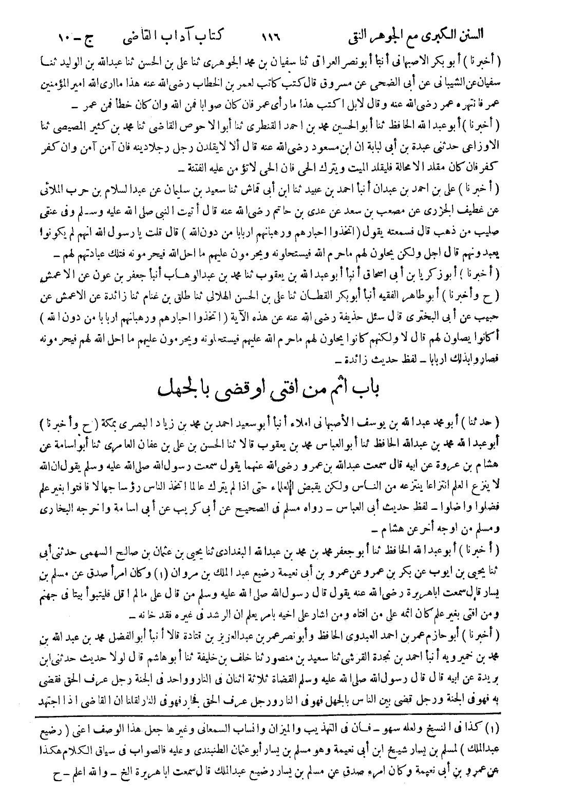 (أخبرنا) أبو حازم عمر بن احمد العبدوى الحافظ وأبو نصر عمر بن عبد العزيز بن قتادة قالا أنبأ أبو الفضل محمد بن عبد الله بن محمد بن خميرويه أنبأ احمد بن نجدة القرشى ثنا سعيد بن منصور ثنا خلف بن خليفة ثنا أبو هاشم قال لولا حديث حدثنى ابن بريدة عن ابيه قال قال رسول الله صلى الله عليه وسلم القضاة ثلاثة اثنان في النار وواحد في الجنة رجل عرف الحق فقضى به فهو في الجنة ورجل قضى بين الناس بالجهل فهو في النار ورجل عرف الحق فجار فهو في النار لقلنا ان القاضى إذا اجتهد